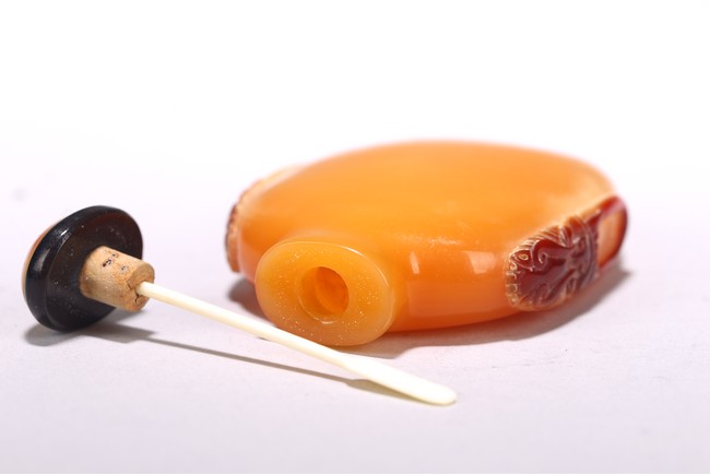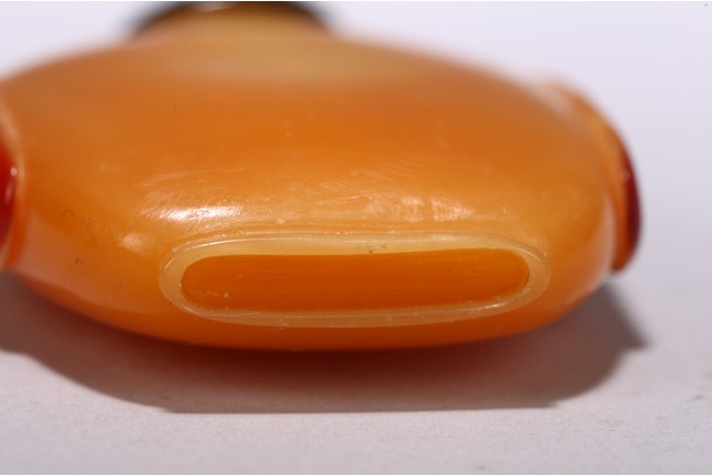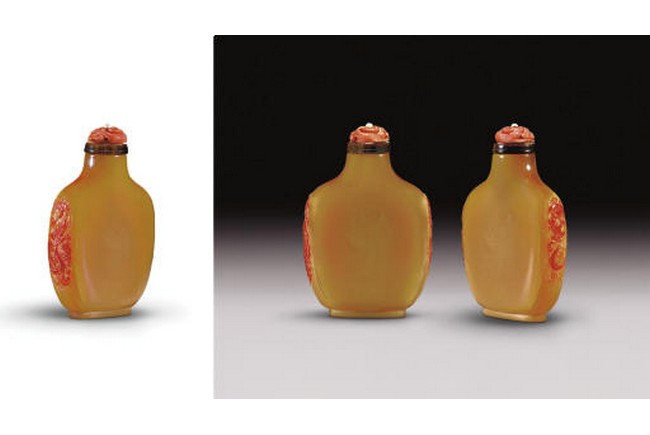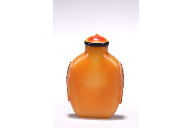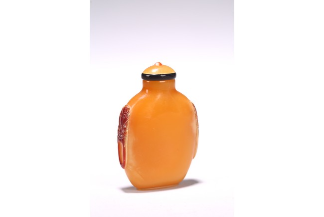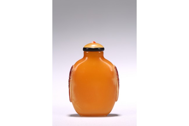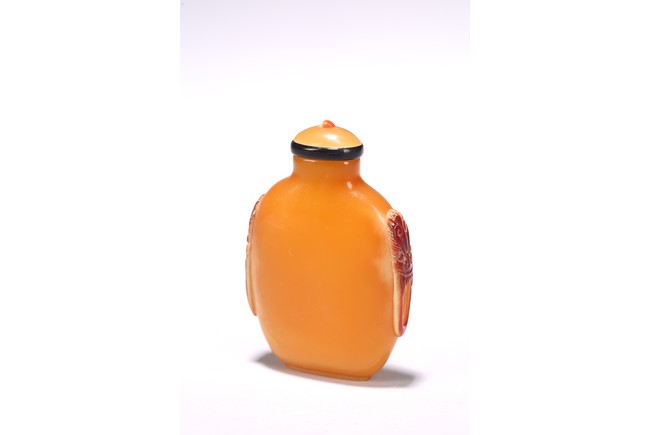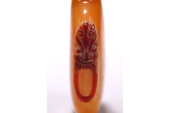 Of flattened form with flat lip and recessed flat foot surrounded by a footrim,the material of warm,orange-yellow tone,carved through the red surface on the sides with mythical beast masks as handles,with stopper. 18th century,Qing Dynasty period.