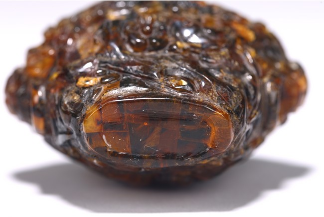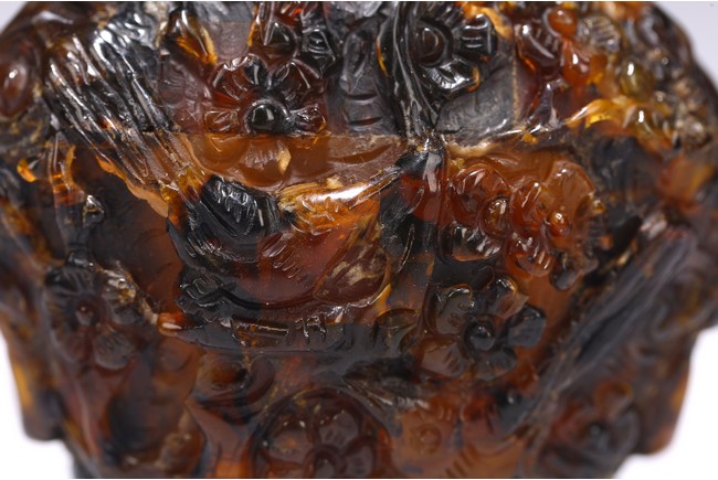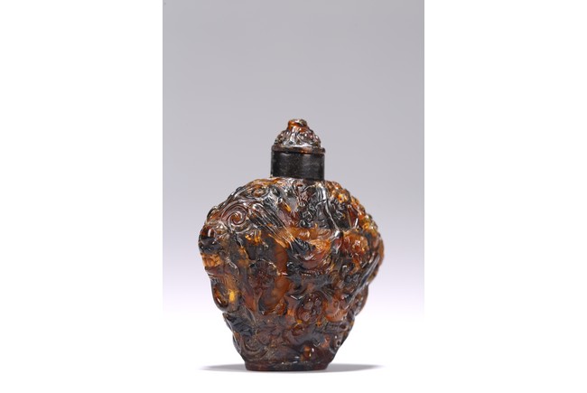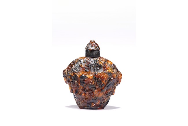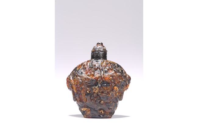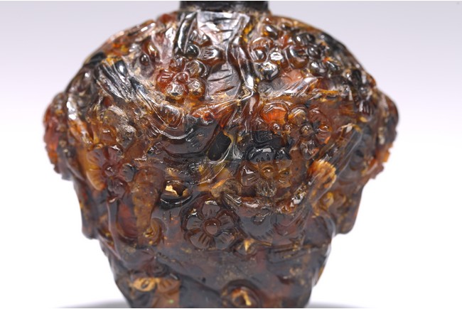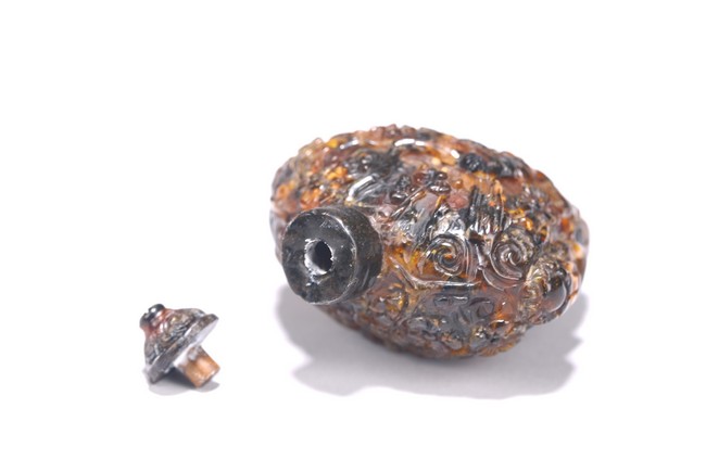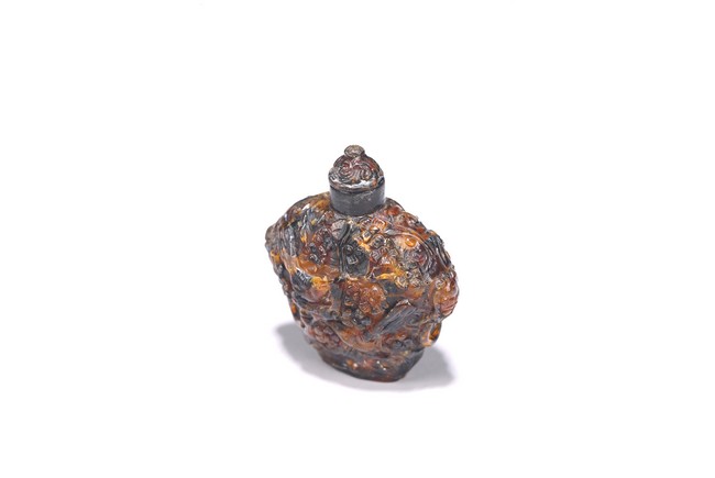 The mottle colored amber snuff bottle carved with various figures in relief. With stopper. Qing Dynasty period.