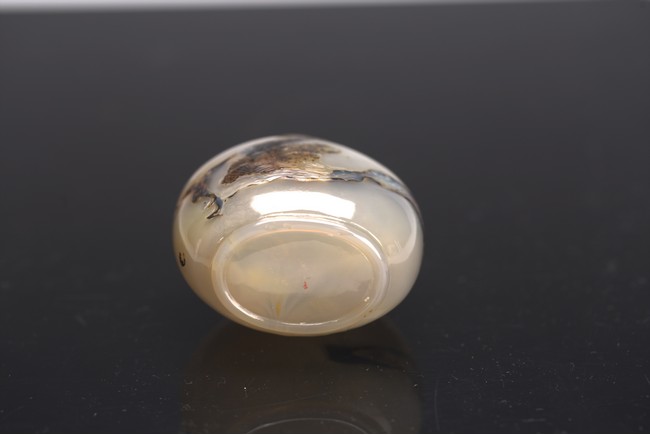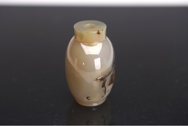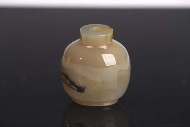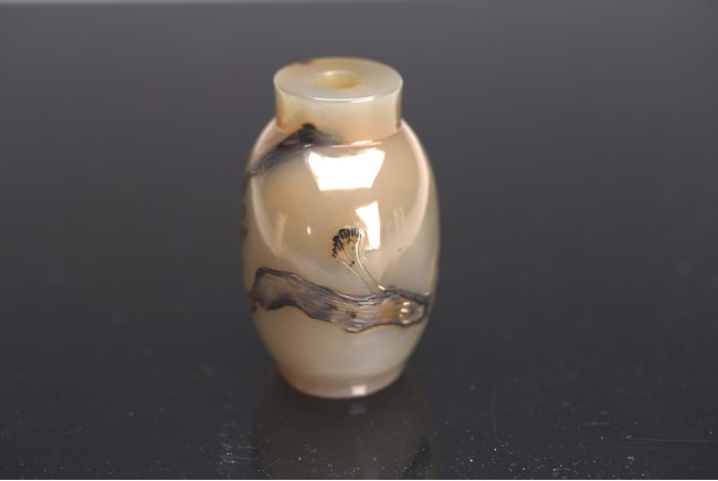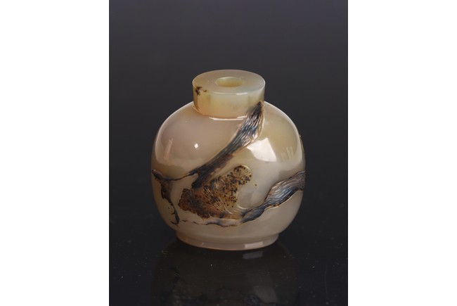 The bottle is relief-carved incorporating shadow inclusions to depict a large pine emerging from rocks. Qing Dynasty period.