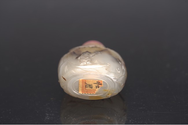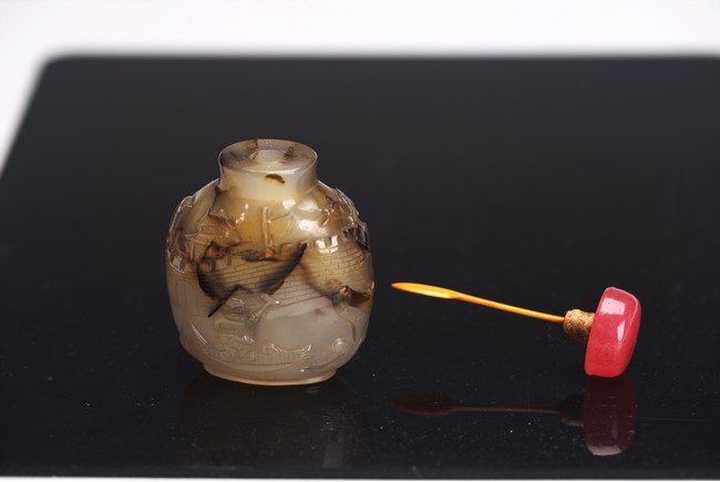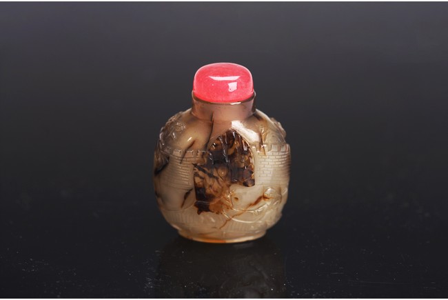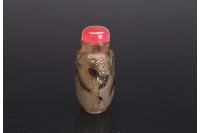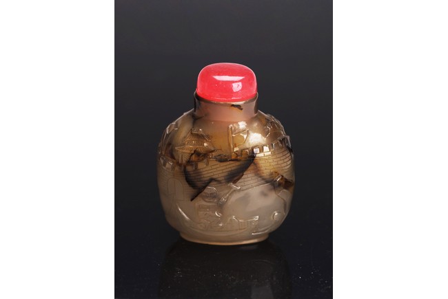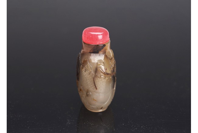 The bottle is of rounded rectangular form,carved around the body incorporating shadows in a continuous scene of figure rowing boat and figure walking a horse over a bridge,with a long fortress wall behind them,with stopper. Qing Dynasty period.
