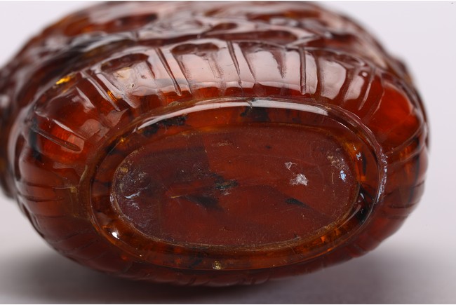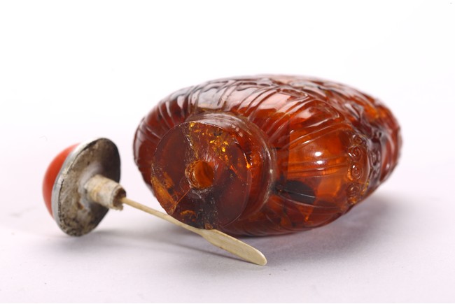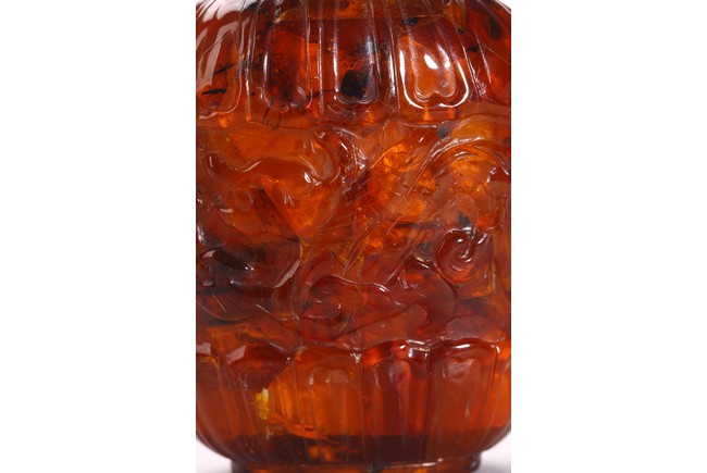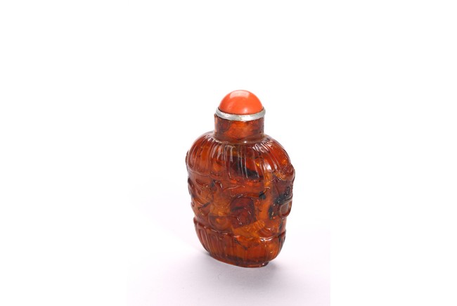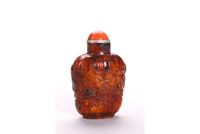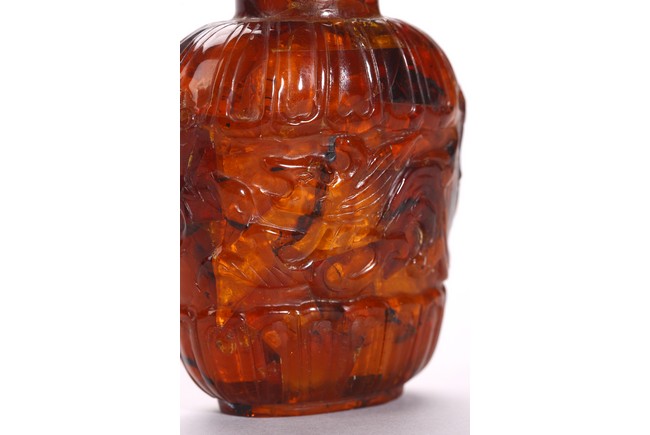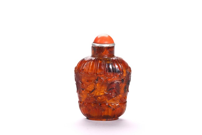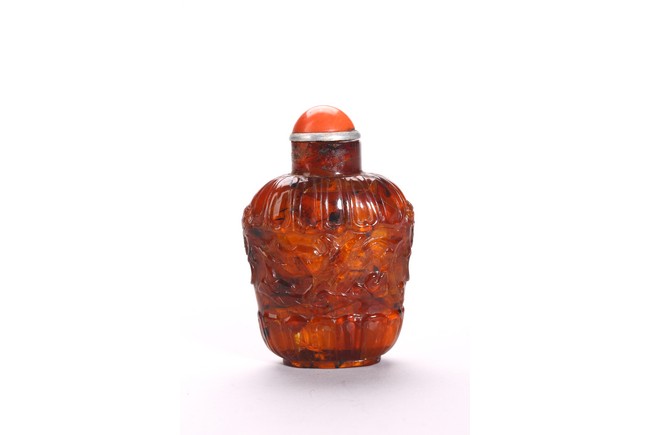 The amber snuff bottle carved in relief with mythical beasts on the body,the sides flanked by pair of raised mythical beast handles,all in between two bands of petals around the neck and base. Coral stopper. Qing Dynasty period.