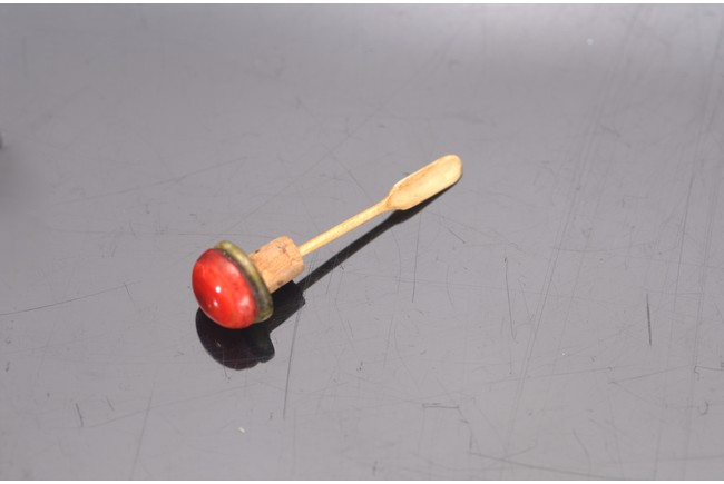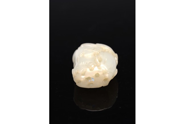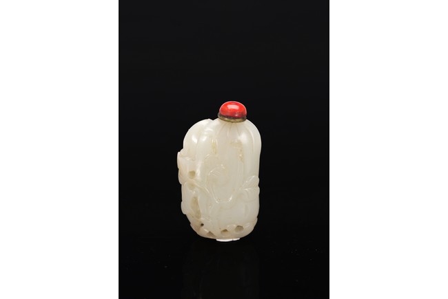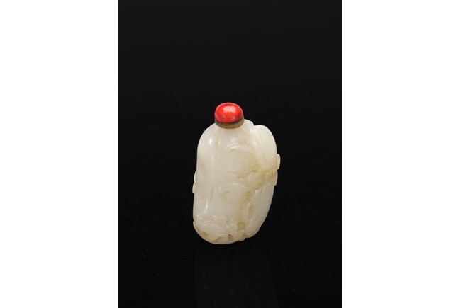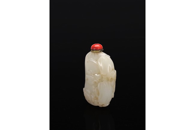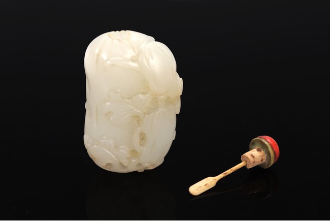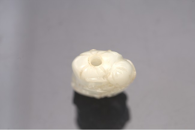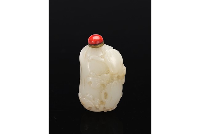 Well-hollowed,carved as a melon with smaller leafy melons clinging to its sides,the stone is of polished even white tone. Withy Stopper. Mid Qing Dynasty period,1750-1800.