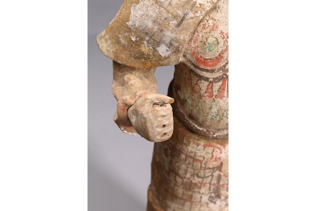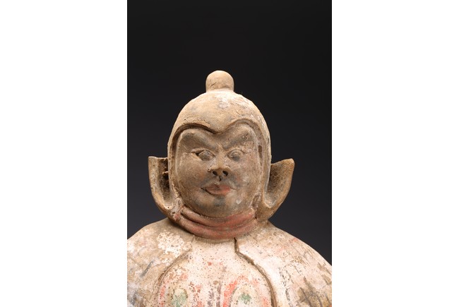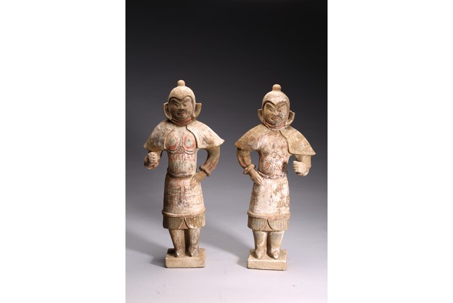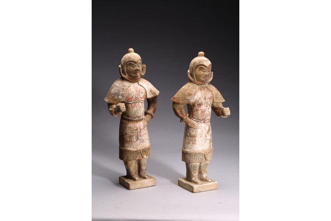 Each modelled with fierce expression framed by helmet,wearing armor bearing traces of paint,one hand on the hip and the other hand as if holding halberd,with traces of orangey-red,green pigment,black pigments. Tang Dynasty period. Accompanied with oxford thermoluminescence analysis report.