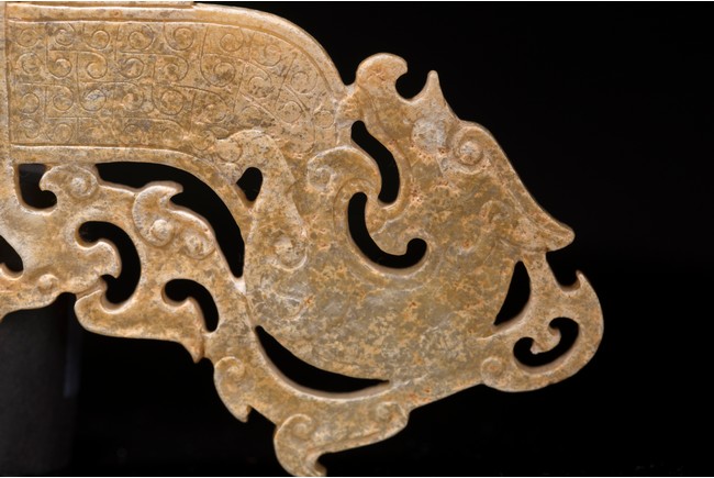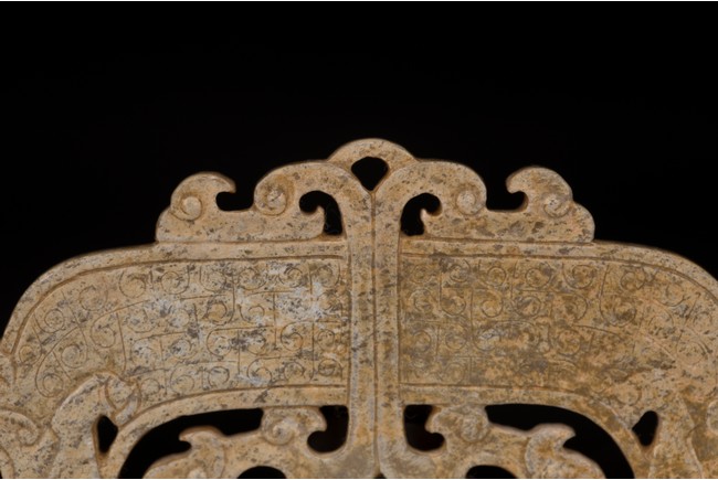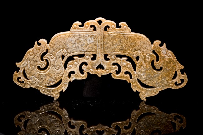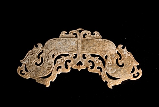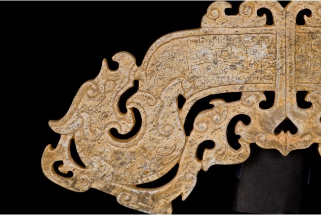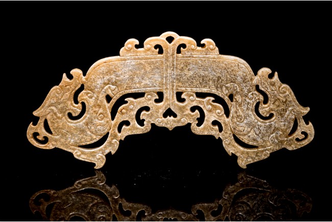 The arc-shaped pendant is carved with a dragon's head on both ends with their bodies intertwined at the centre between openwork flange,the stone is of brownish-white color with areas of opaque buff-colored alteration. Warring State period or later.