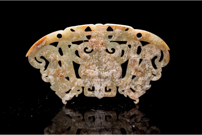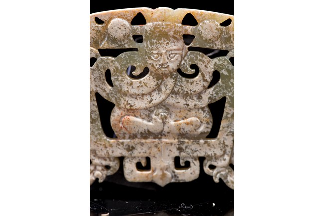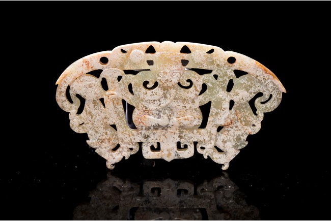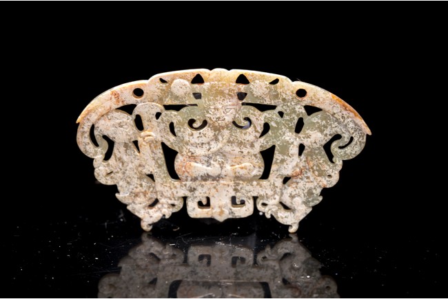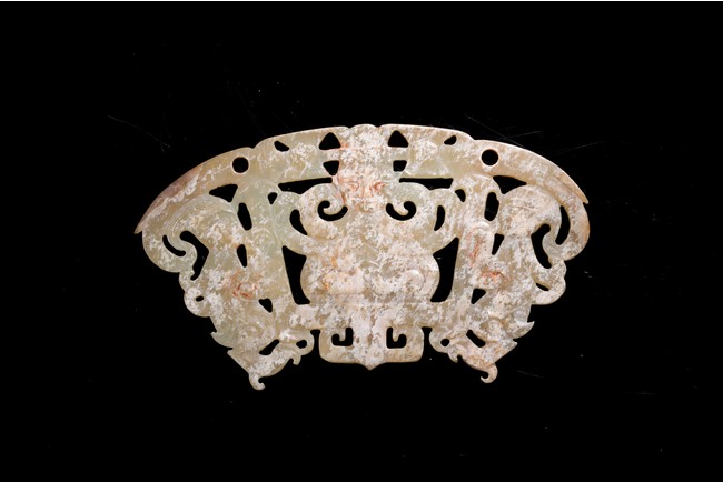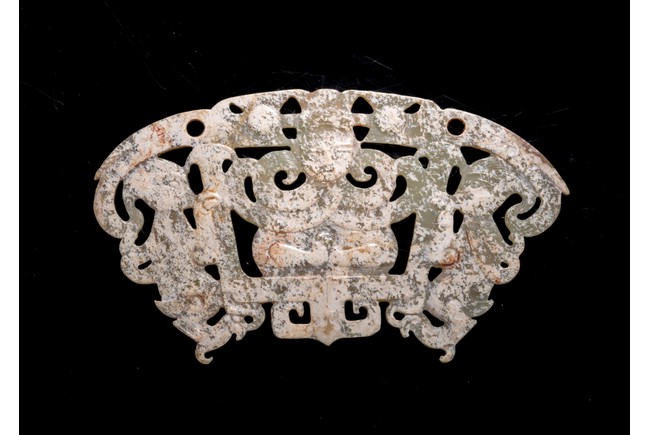 Carved and pierced with two attendant figures flanking a central large figure facing forward,the stone is of celadon tone with white calcifications. Western Zhou dynasty or later.