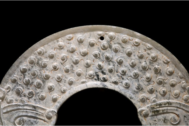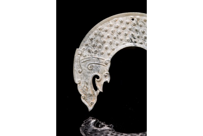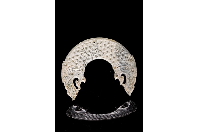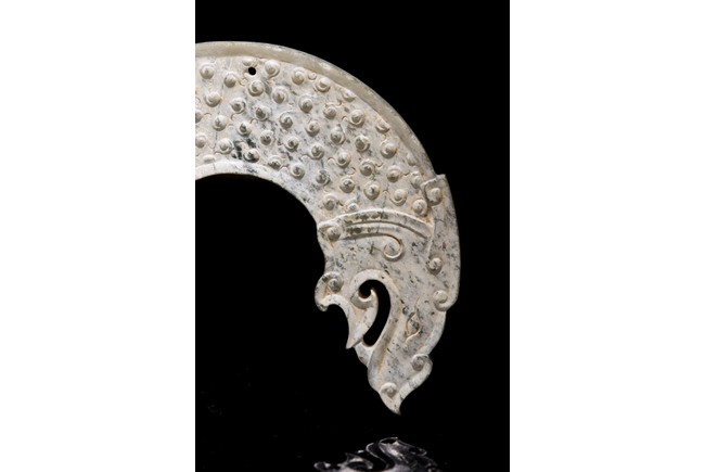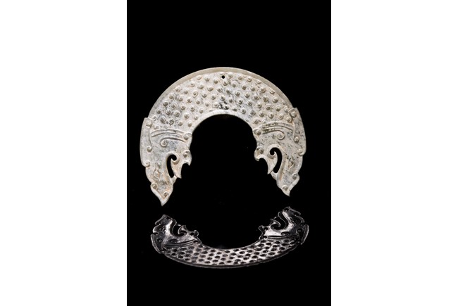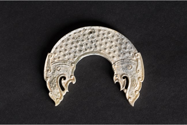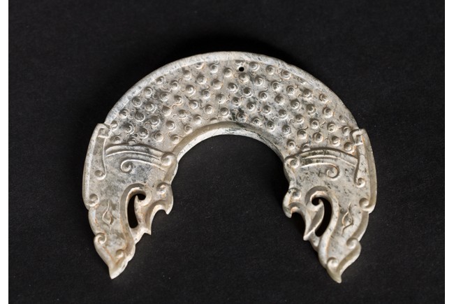 The arc-shaped pendant is carved with a dragon's head with a split mouth on both ends with a conjoined body,carved with comma spirals on both side and pierced with a suspension hole to the center. The semi-translucent stone is of celadon tone with extensive areas of white calcifications. Warring state period or later.