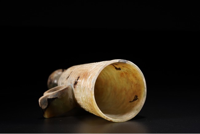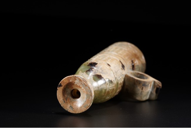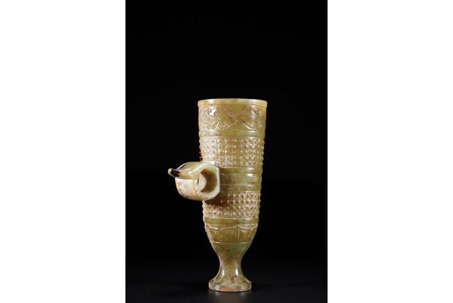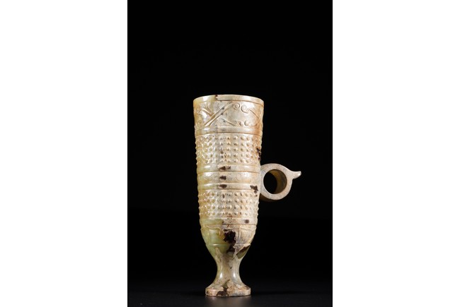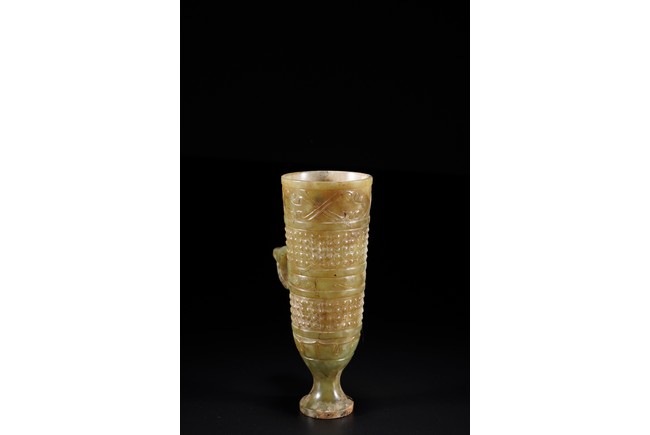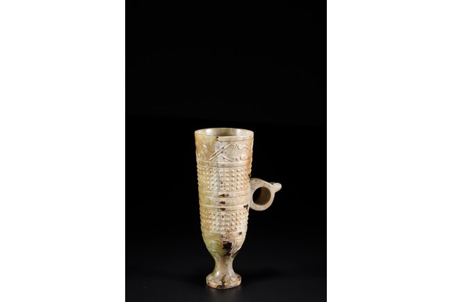 The cylindrical cup supported on spreading foot,body carved with bands of raised bosses separated by band of scrolls,the side flanked by a circular handle,the stone is of celadon and russet tone with extensive areas of calcification. Han Dynasty period or later.