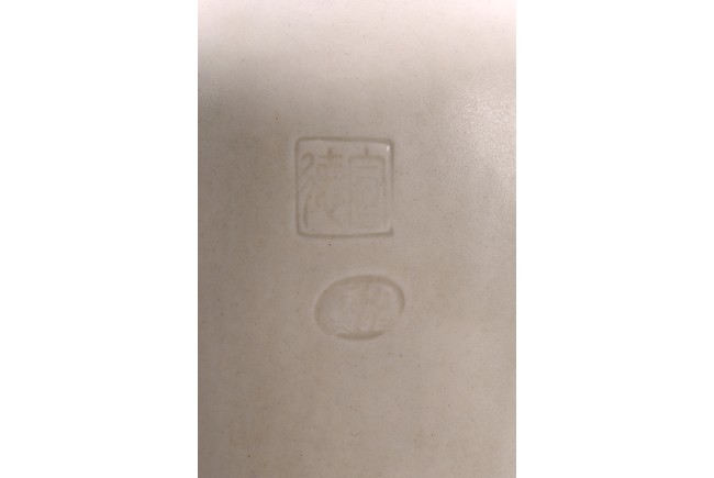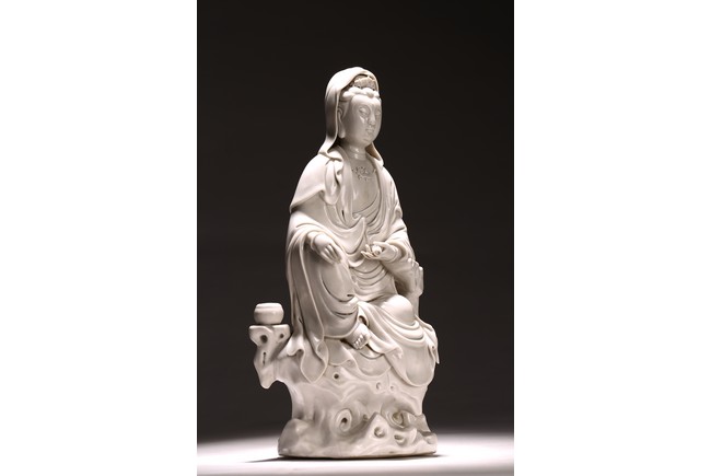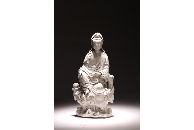 The female deity seated in 'Royal Ease' on a high rockwork pedestal base,wearing a long flowing hooded robe falling in deep U-shaped folds around her body and down over the rocks,to her right a bowl is supported on a rocky ledge,her reverse impressed with two seal marks. Qing Dynasty period.