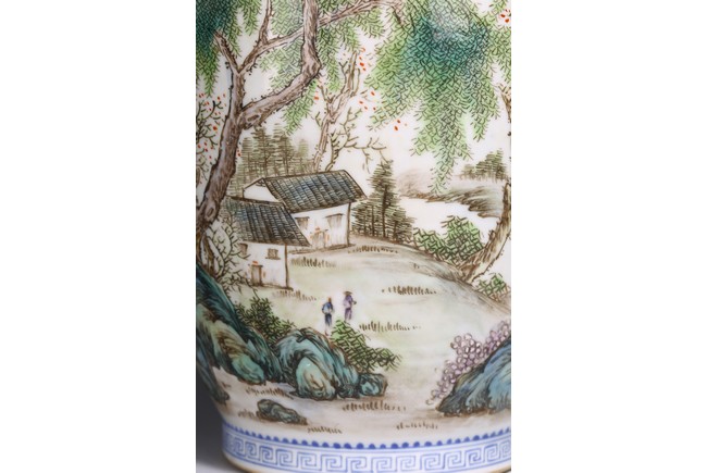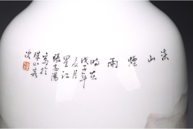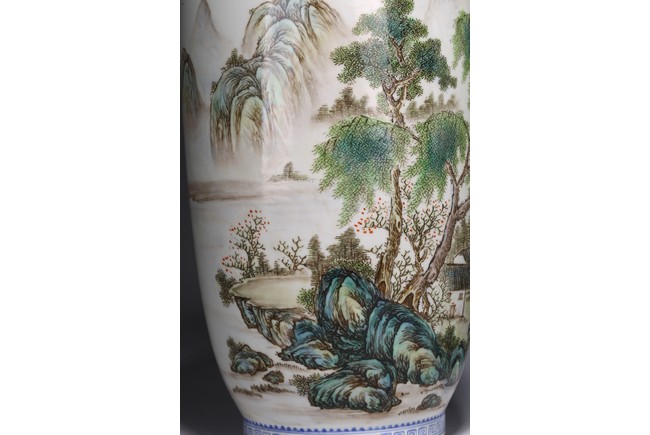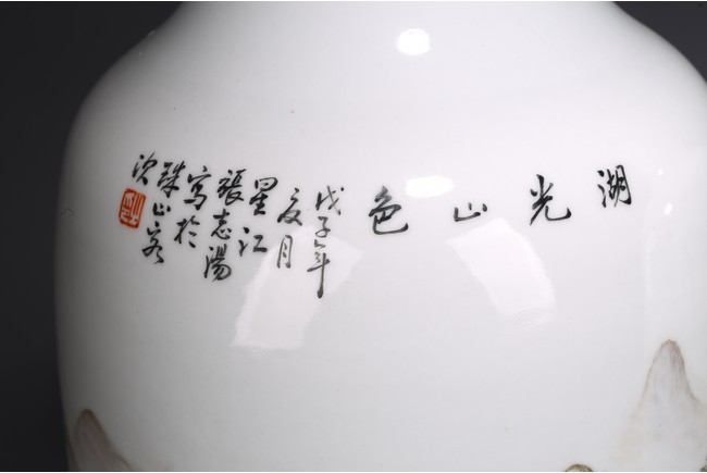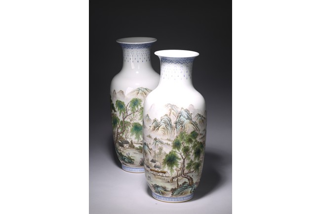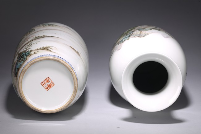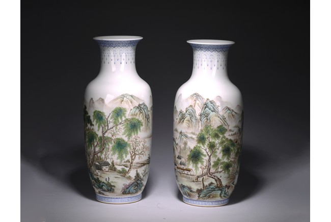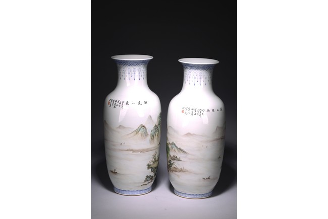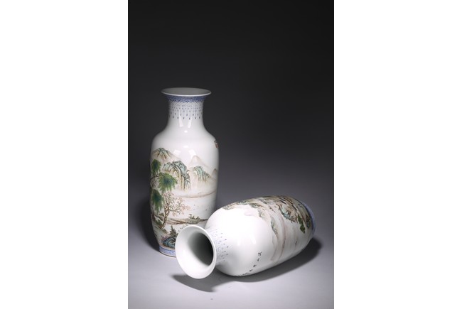 Each rouleau vase elaborately painted around the body with landscape scene including hills,boats,cliffs,trees,huts,etc. and inscribed with poetry and signed Zhang Zhitang,the base inscribed with three character mark. Republic period.