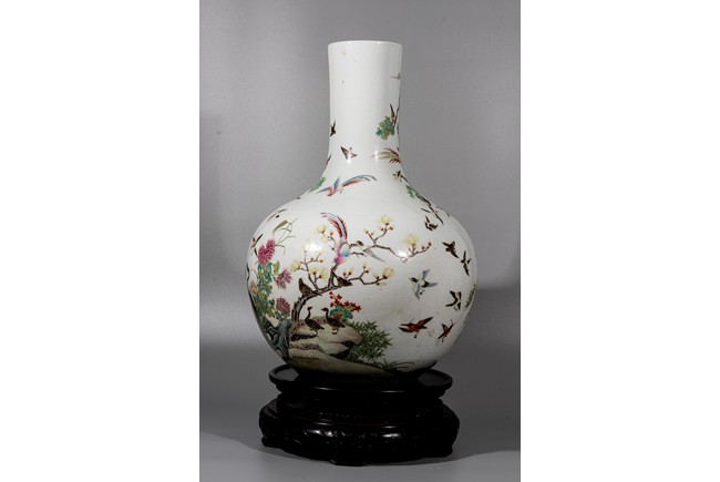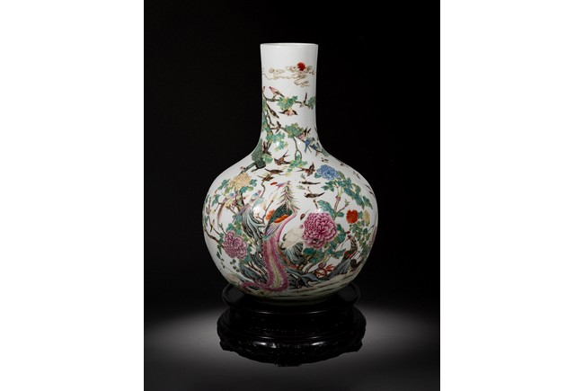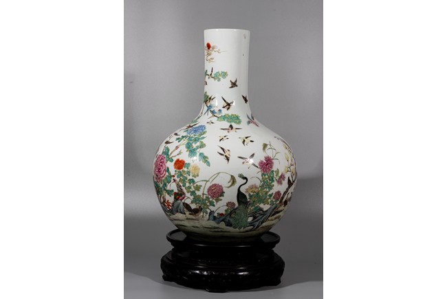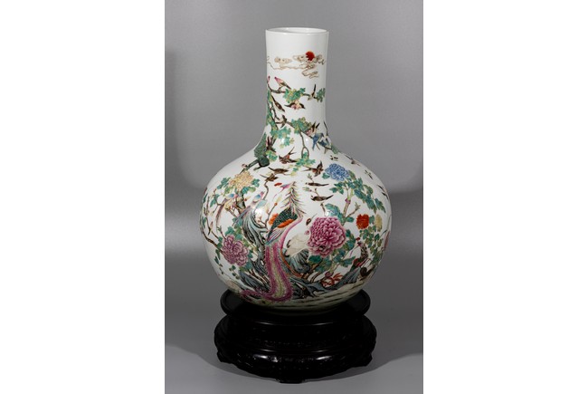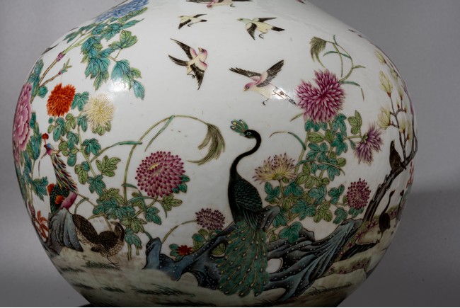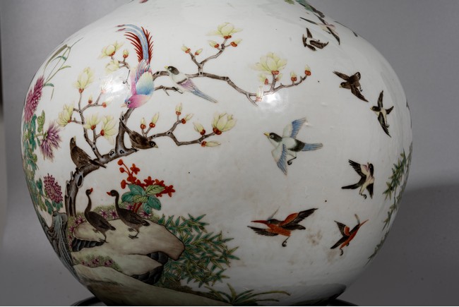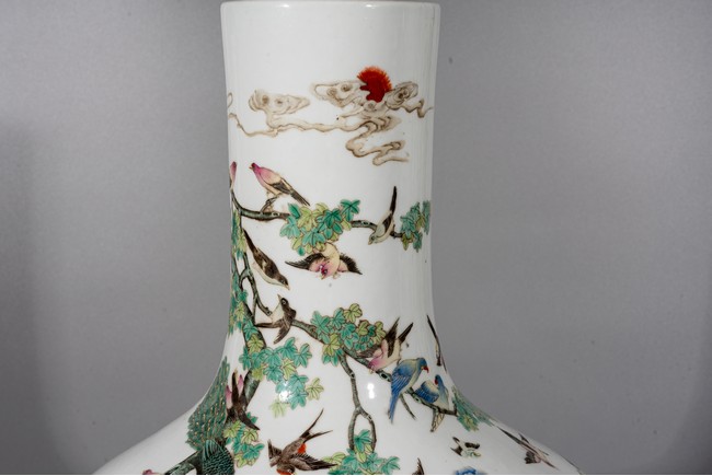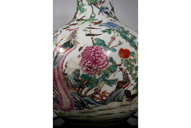 With the globular body rising from a recessed base to a tall cylindrical neck,brightly enameled to the exterior with a phoenix pair amid various birds including peacocks,cranes,herons,ducks,and orioles within a landscape of flowers and rockwork,the base with a six-character Qianlong mark in red. Qing Dynasty period.