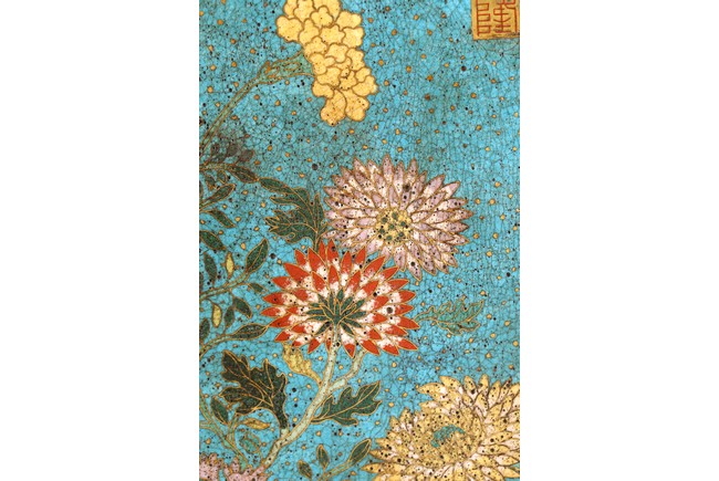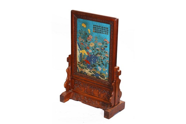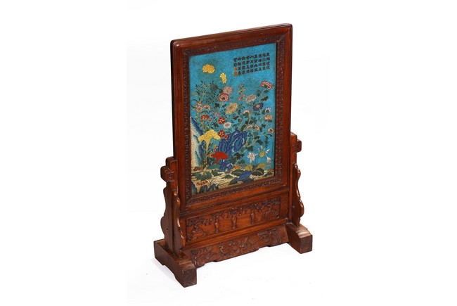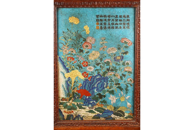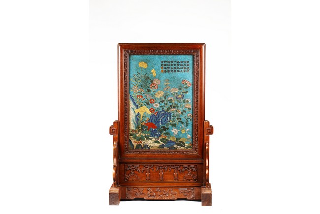 Of vertical rectangular form,the panel decorated in variety of bright colored enamels to depict various chrysanthemum and lingzhi issuing from the rocks below,the upper right side inscribed with Imperial poem praising the flowers,with two seal marks read Qian Long,all against turquoise blue ground,the hardwood frame carved with key-fret pattern and stand carved with bogu pattern in relief. Qing Dynasty Qianlong period.
