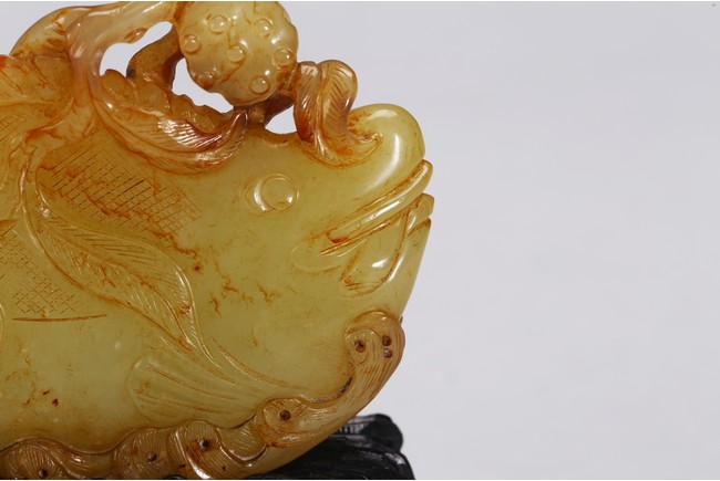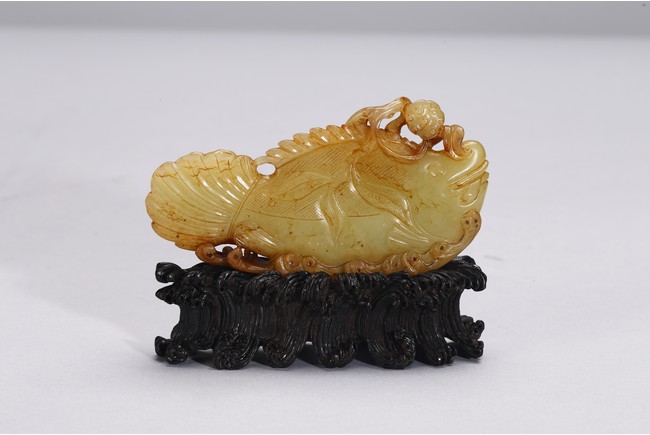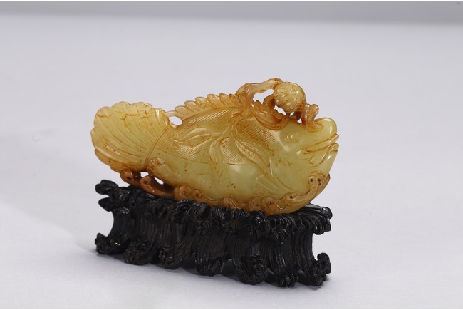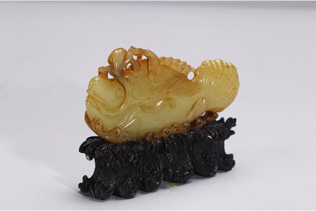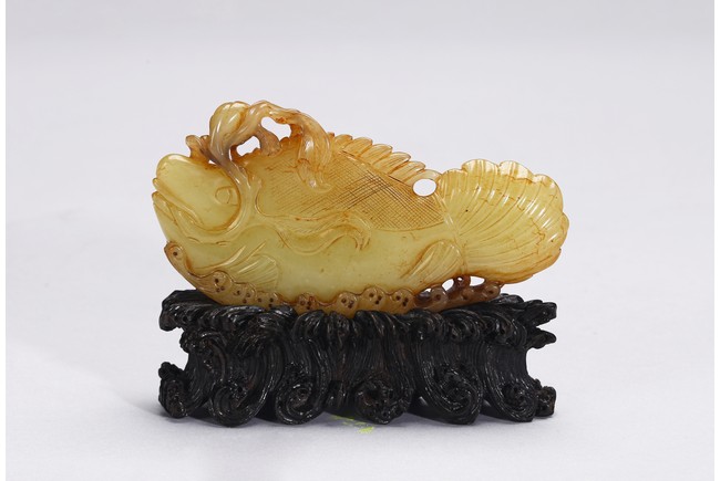 A CHINESE YELLOW JADE 'FISH' CARVING 清 黄玉鳜鱼摆件 紫檀座