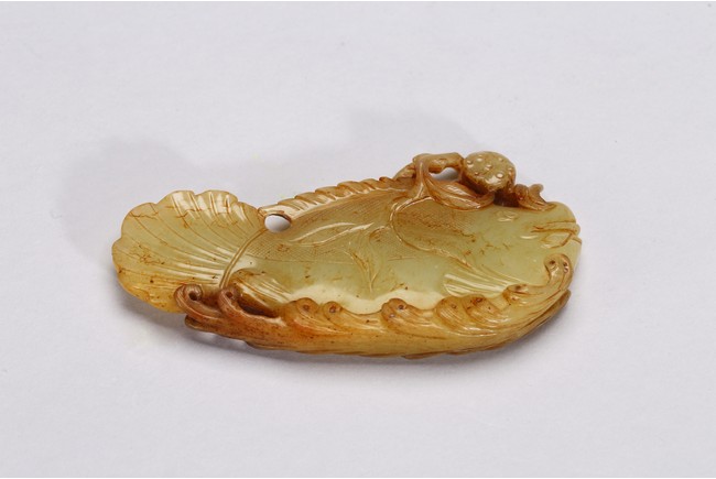 A Chinese Yellow Jade 'Fish' Carving. With zitan cover. Qing Dynasty period.