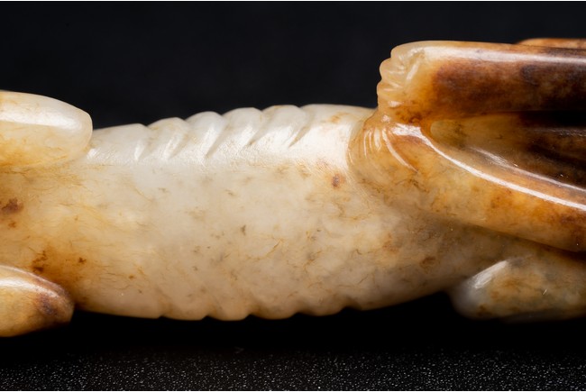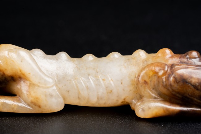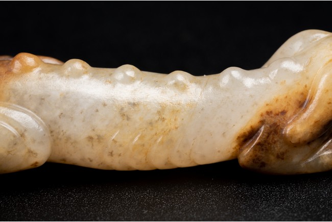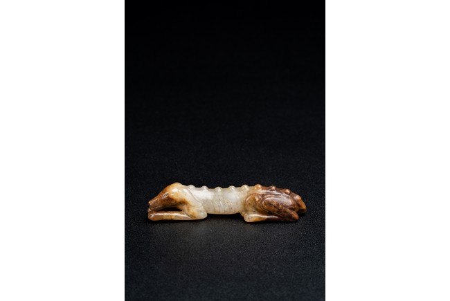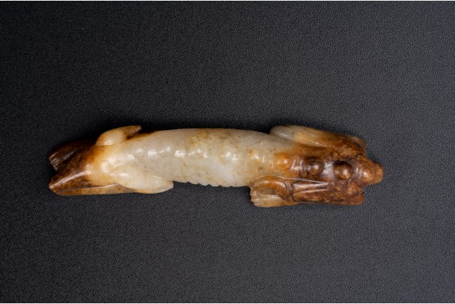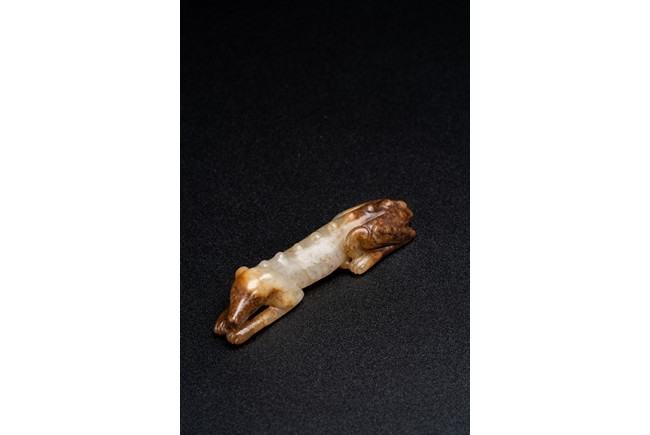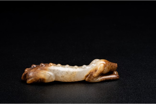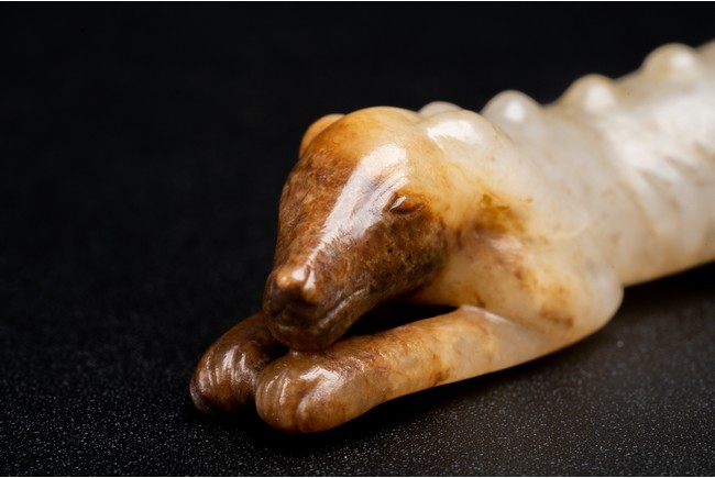 Finely modelled as a recumbent dog resting on its front paws,with hind legs tucked under its body and the long tail curled up alongside its haunch,depicted with a long backbone with well-defined rigid spine,the softly polished stone of white tone with russet inclusions. Song Dynasty period.