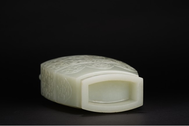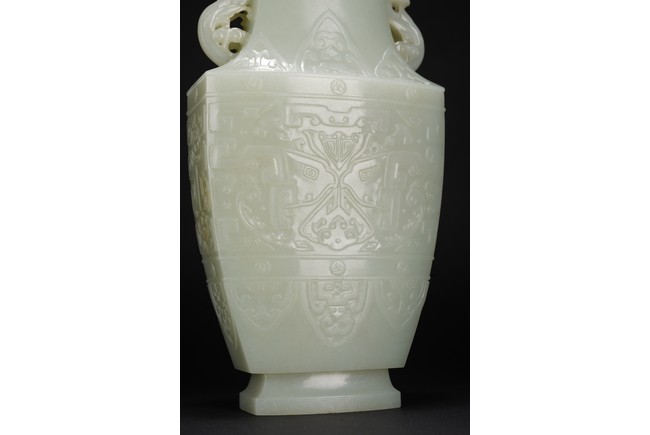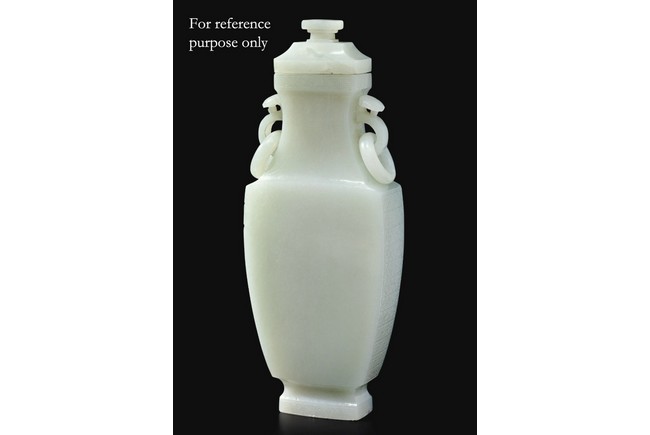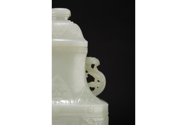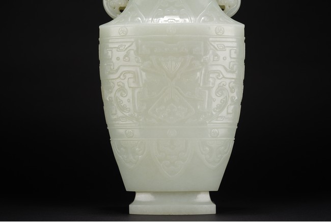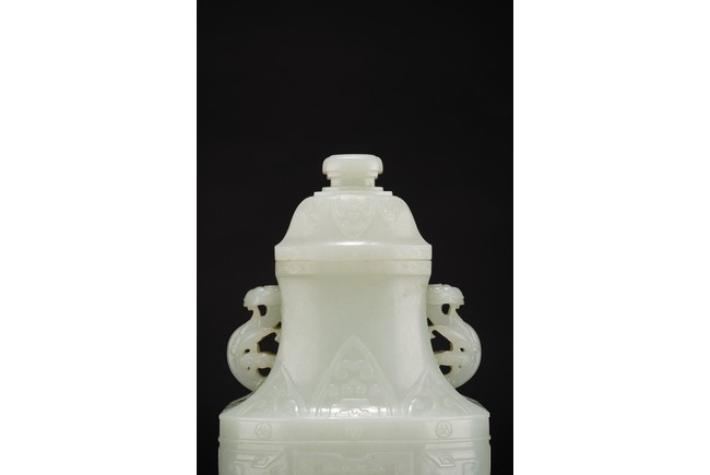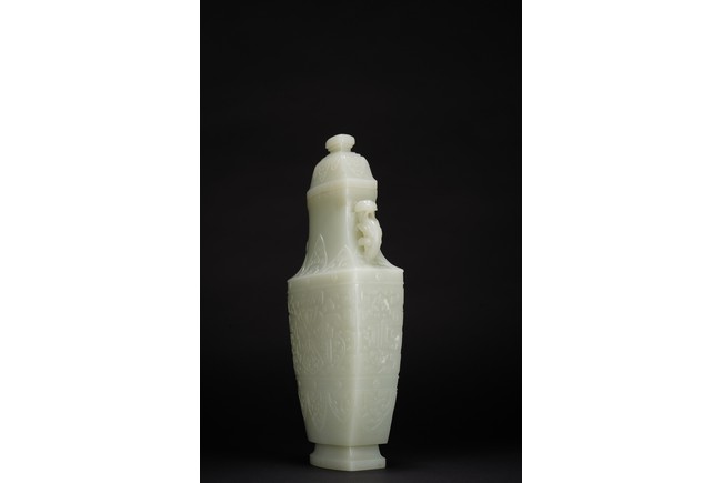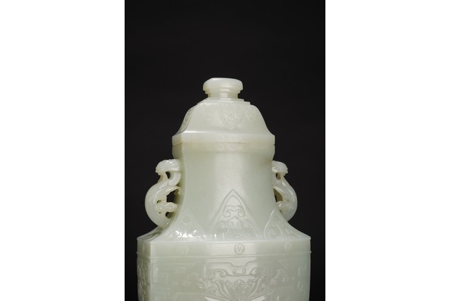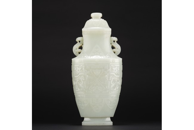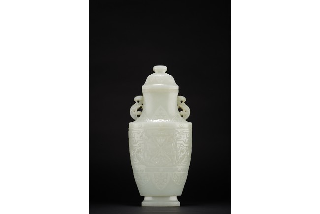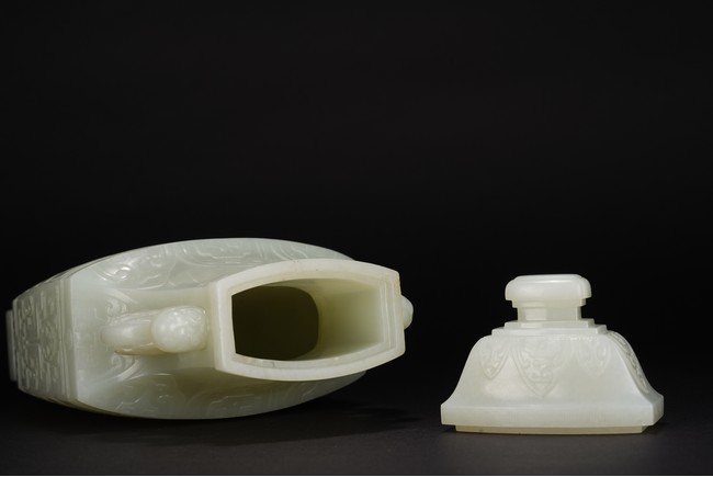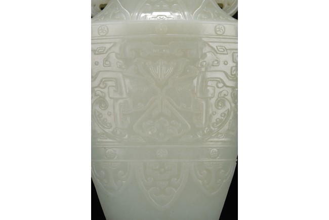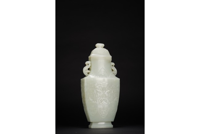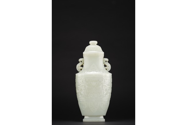 The baluster body rising from a stepped foot,the waisted neck surmounted by a lipped rim and flanked by a pair of lingzhi handles finely carved in low relief to each side with a stylized taotie mask,all between bands of pendent lappets above the foot and around the neck,the domed cover similarly decorated and surmounted by a plain finial,the softly polished stone of an even white color. Qing Dynasty Qianlong period.