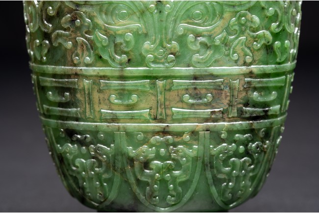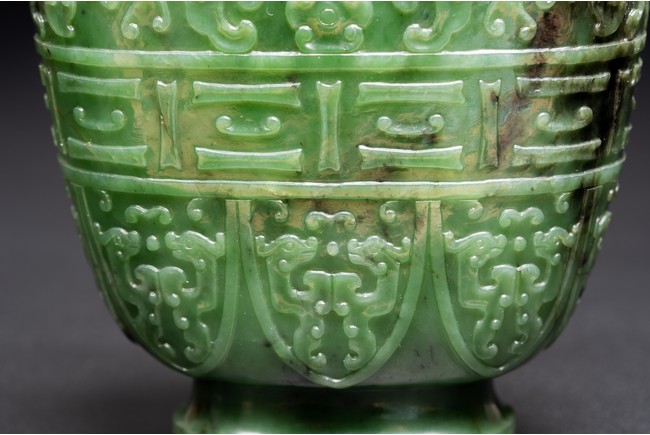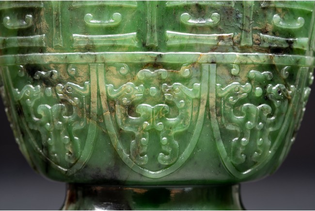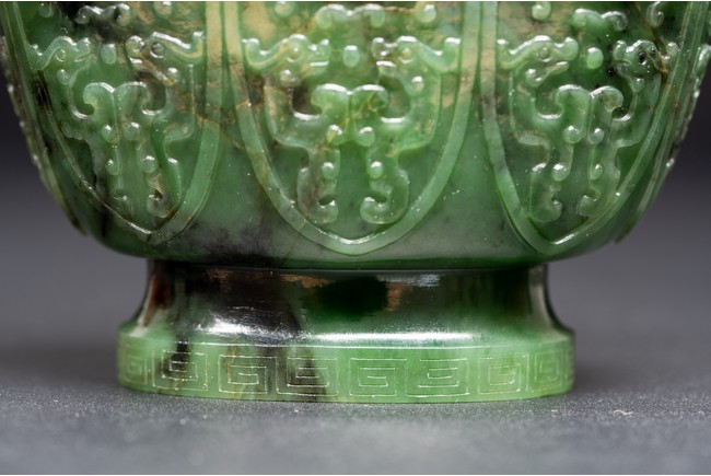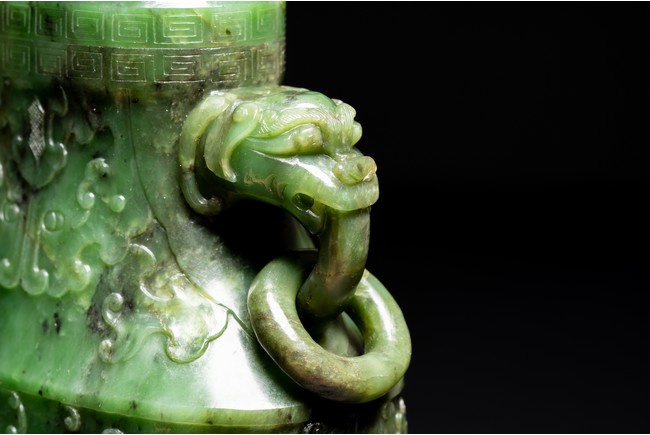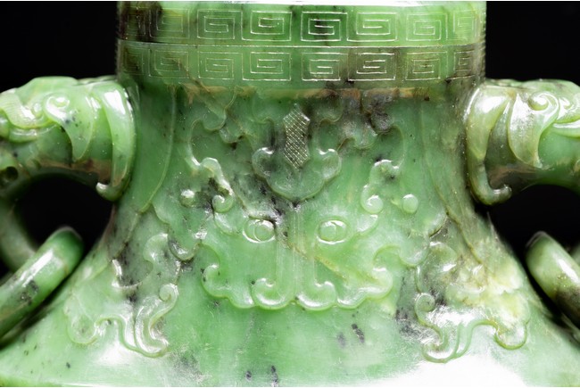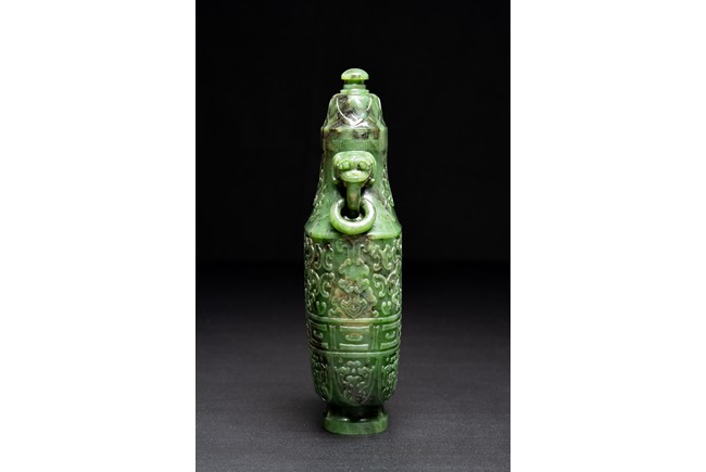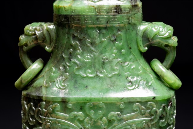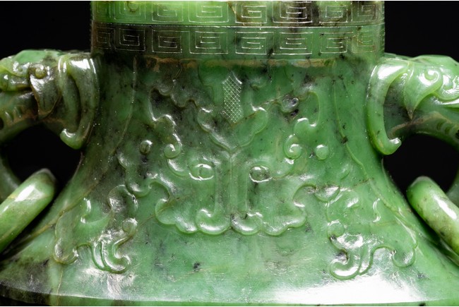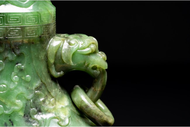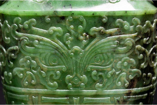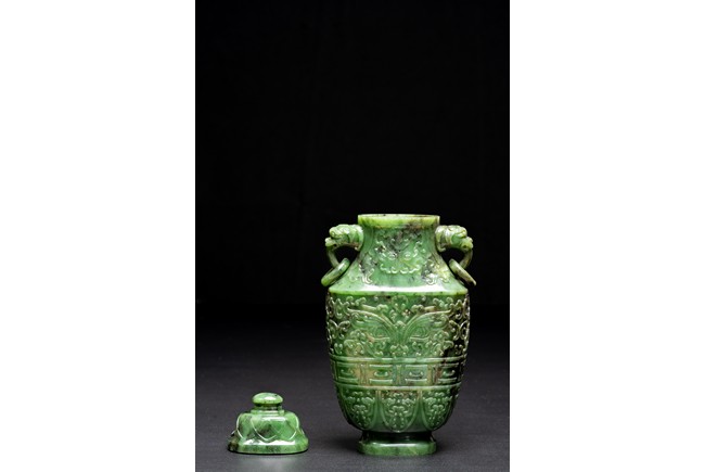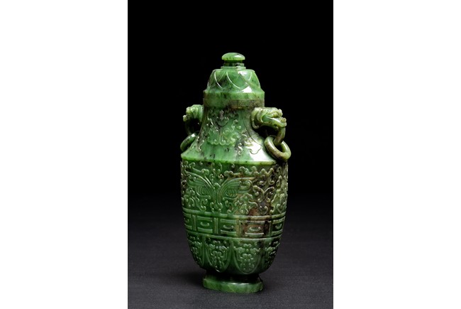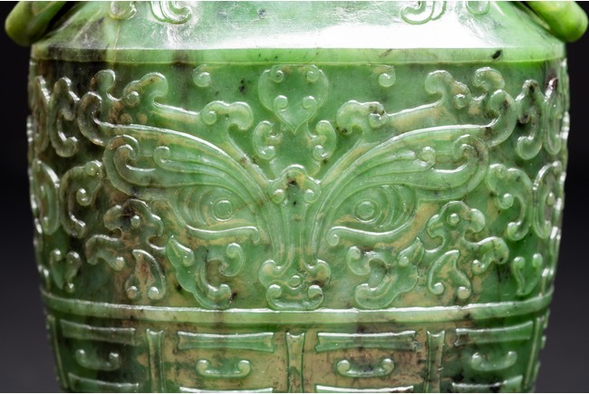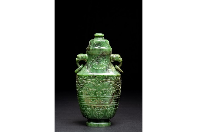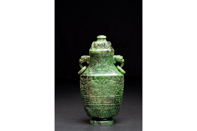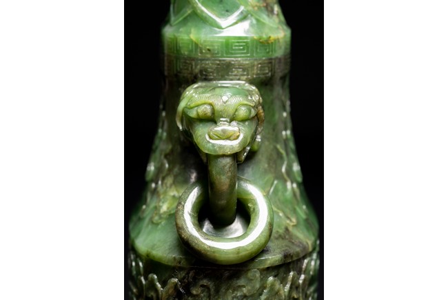 The baluster vase carved low relief on the body with a broad taotie mask on each side,above two registers of archaistic motifs. The neck is flanked by a pair of handles in the form of mythical beast-heads with loose rings. The stone is of an opaque green tone with dark-green area. Qing Dynasty Qianlong period.