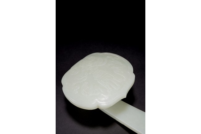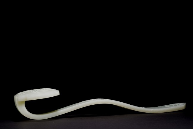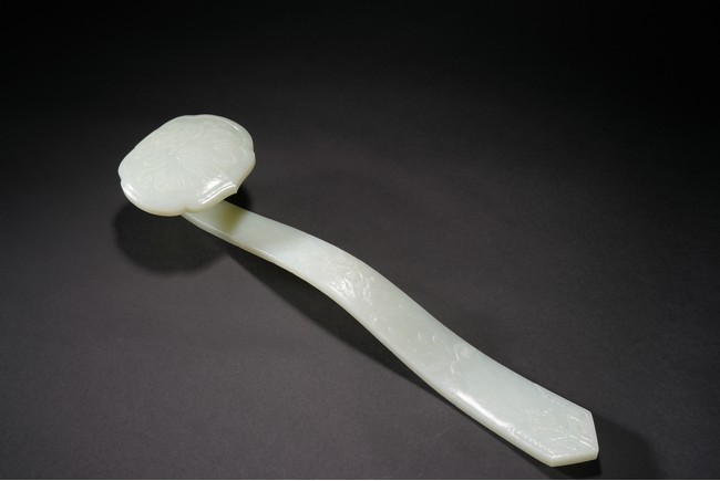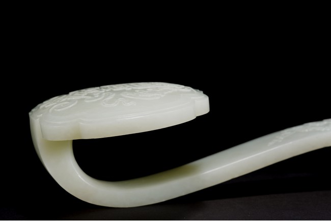 The curved shaft is finely carved to depict prunus branches and flowers in low relief. The ruyi-shaped head is decorated with two auspicious bats in flight flanking a suspending stylized 'shou' (longevity) character pendant. The stone is of an even white color. Qing Dynasty period.