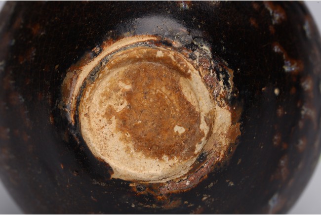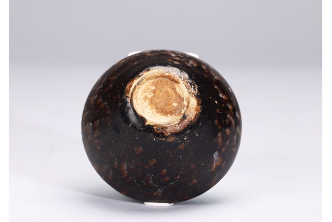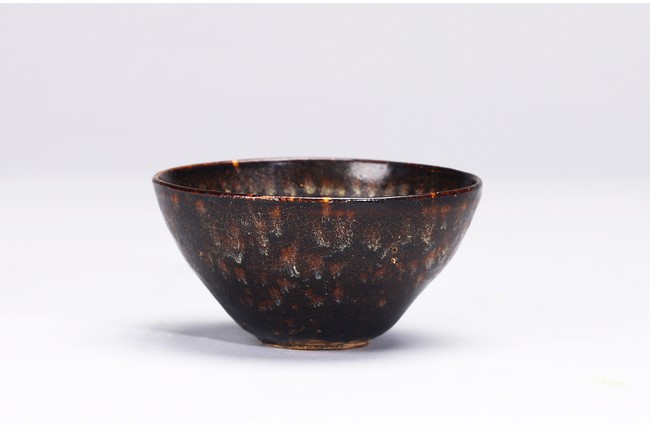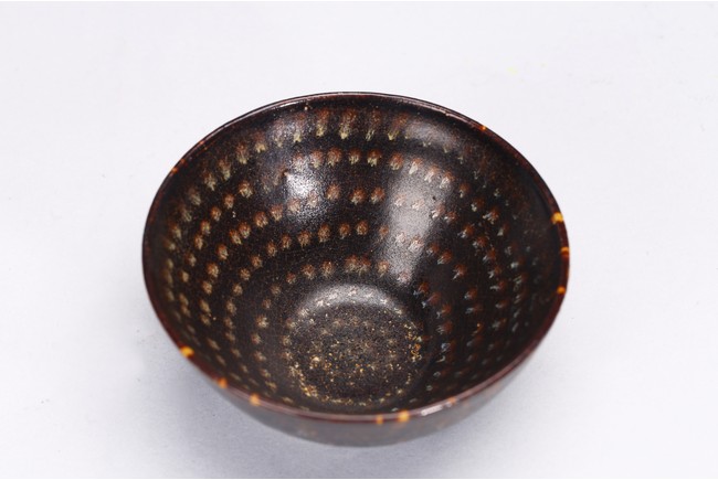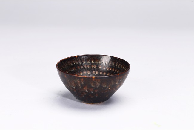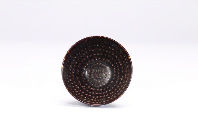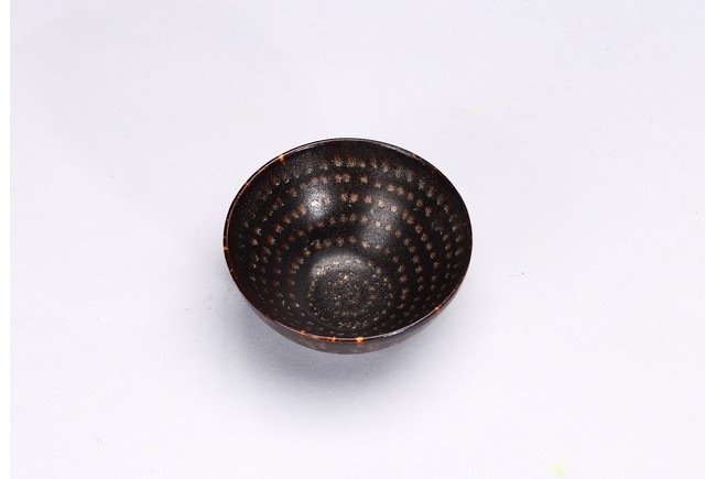 With deep rounded sides rising from a flat base,covered overall in a rich dark chocolate brown glaze with tortoiseshell markings to the exterior and rows of concentric dots to the interior. Southern Song Dynasty period.