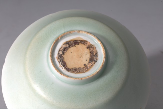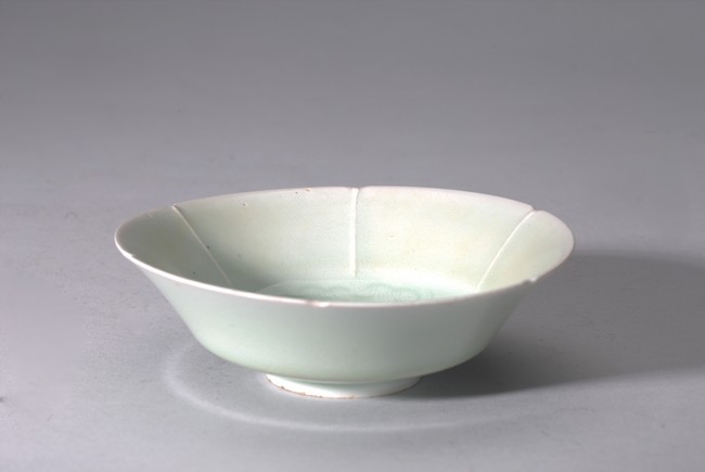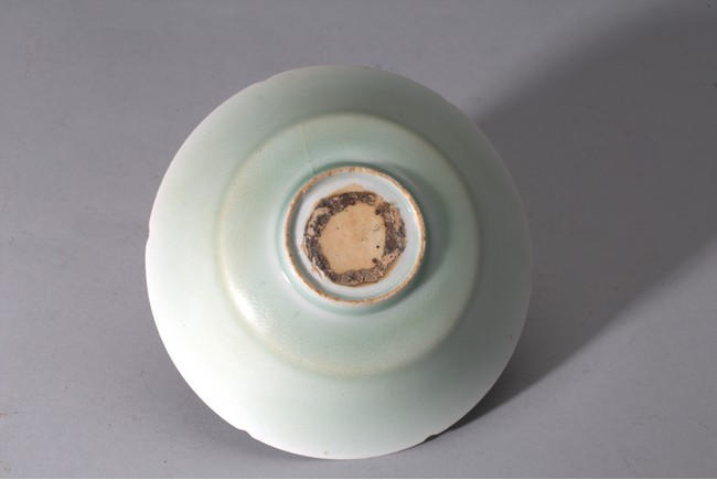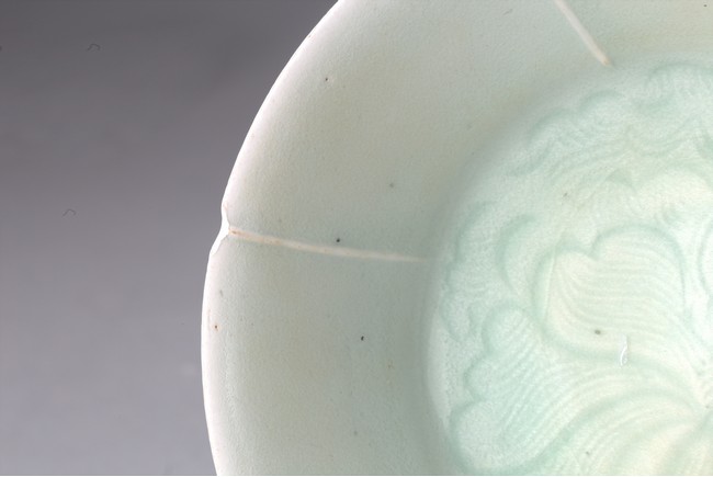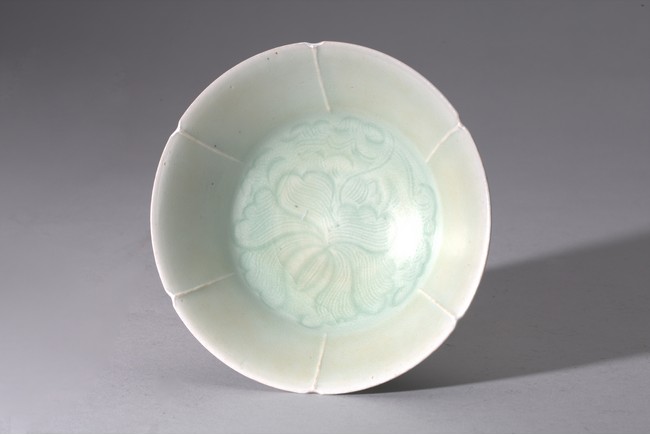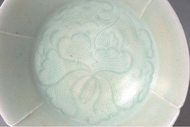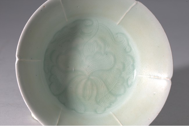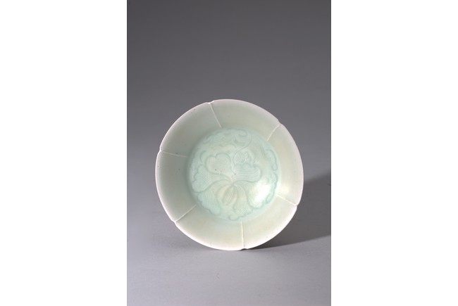 With a six-lobed rim,carved and combed to the interior with flower,covered overall save for the base with a translucent blue-tinged glaze. Southern Song Dynasty period.