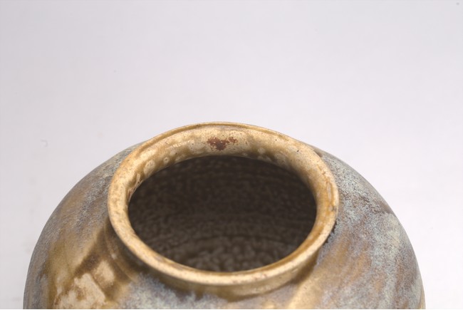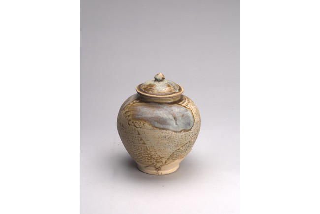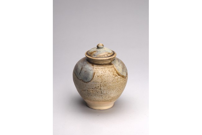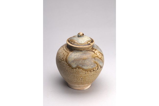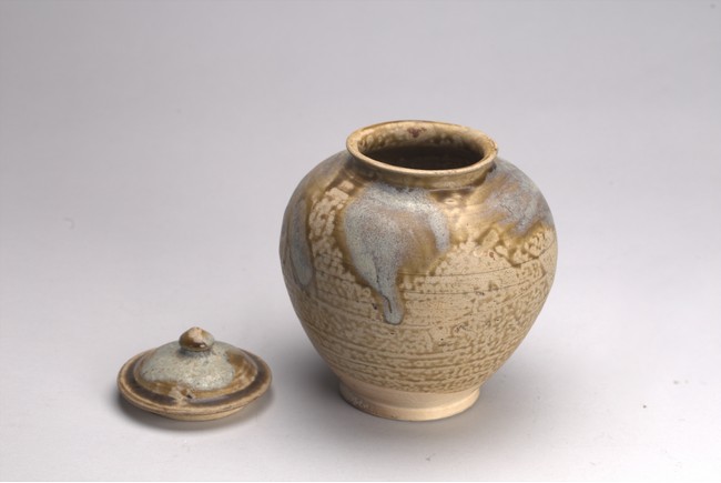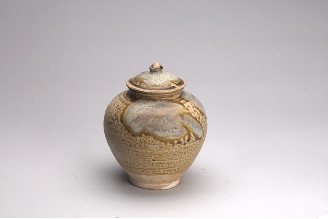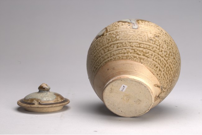 Of globular form with short everted neck,its domed cover with knop finial,covered with splashes glaze of pale blue and dark olive green color. Sui Dynasty or later.