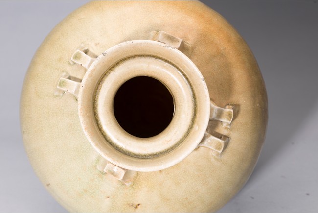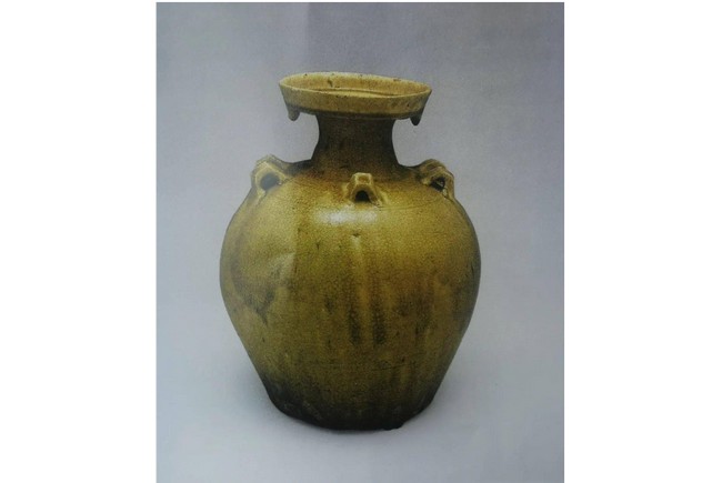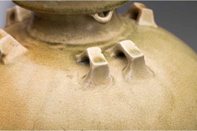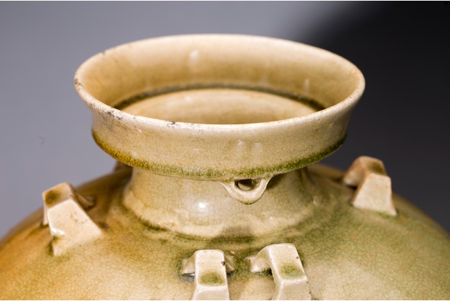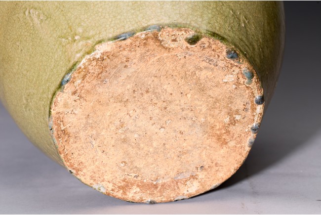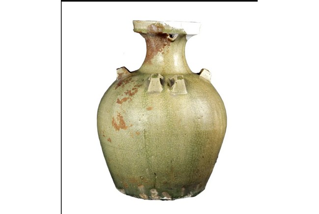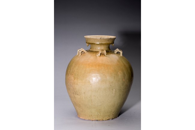 Of well potted bulbous form, the swelling shoulders tapering to the flat base,with six square cut lug handles,surmounted by short waisted neck with galleried rim,covered overall with crackled translucent green and orange glaze, the glazed stoneware base burnt orange in firing. Southern Dynasty period,5th or 6th century.