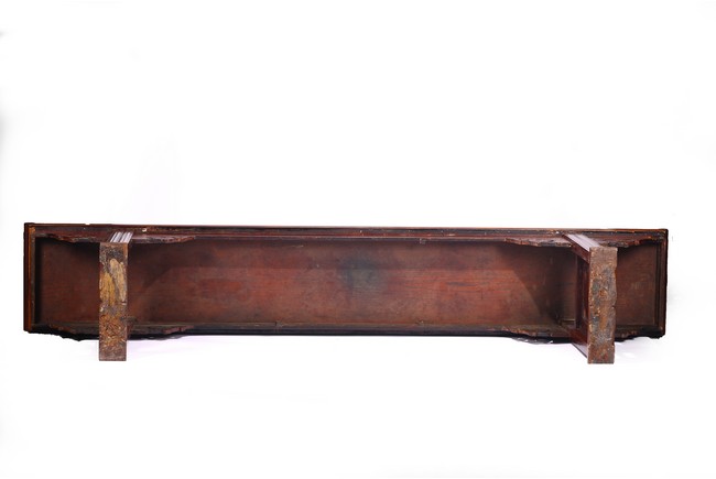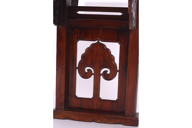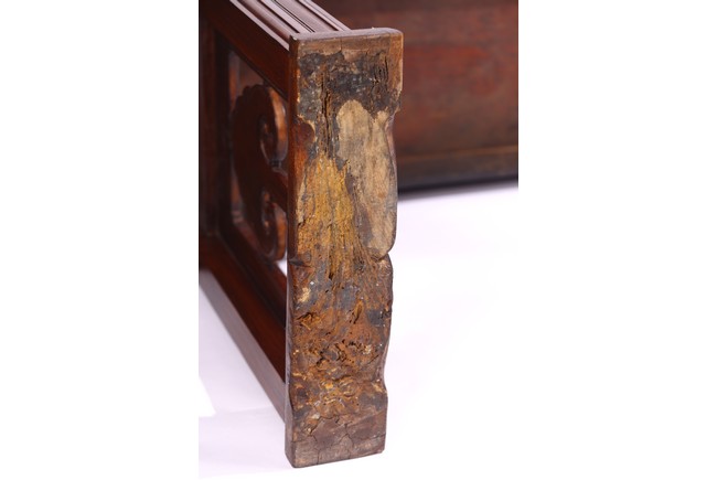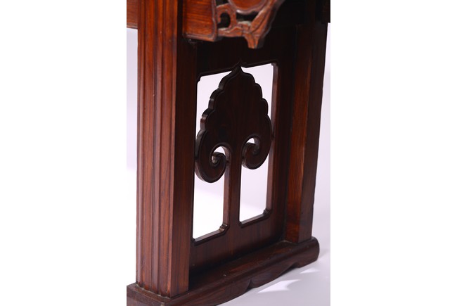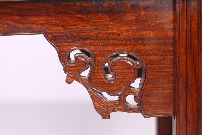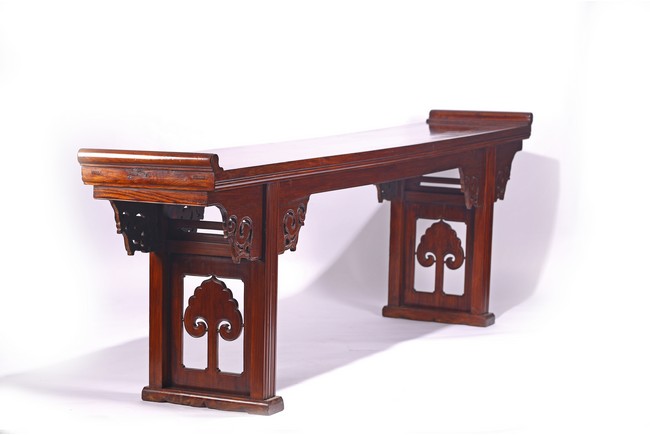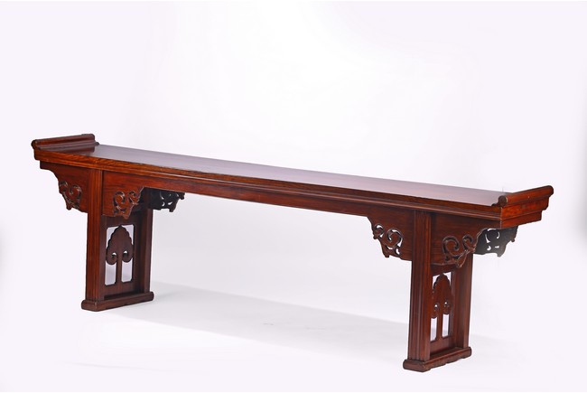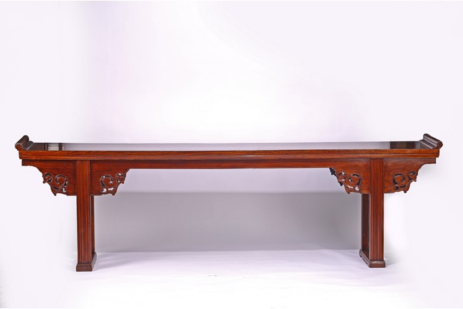 Of impressive size,the long plank top terminating in everted flanges,the spandrels carved in openwork design,the legs and feet framing a ruyi-shaped head design. Late Ming or Early Qing Dynasty period,16th/17th century.