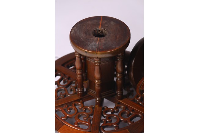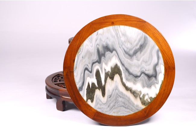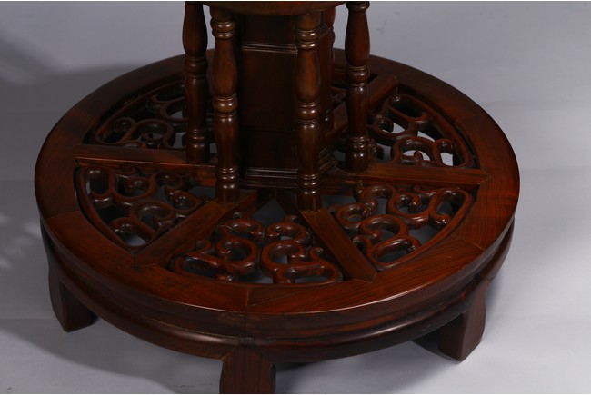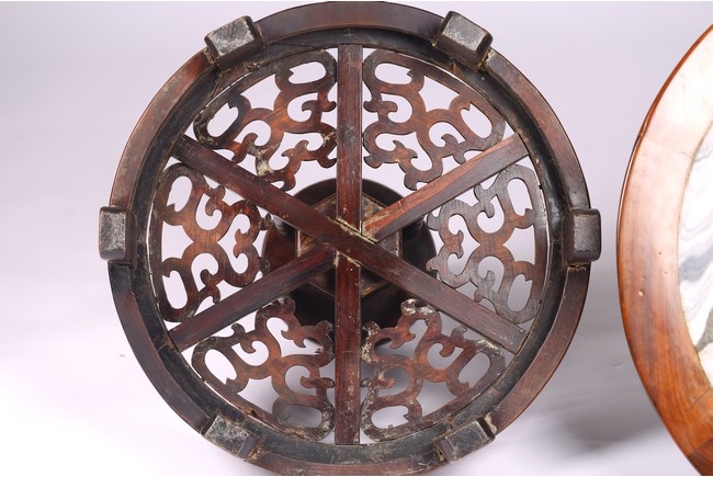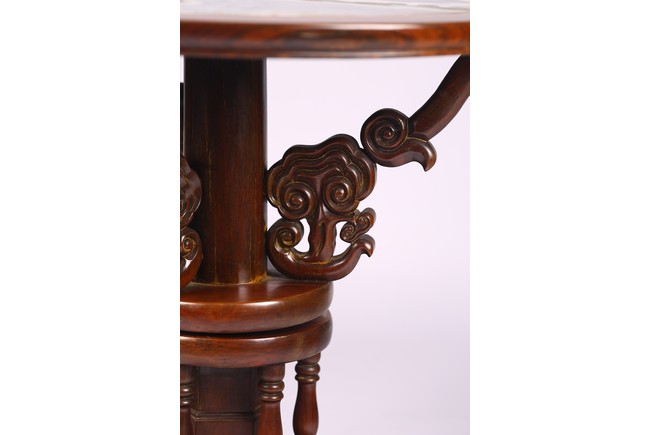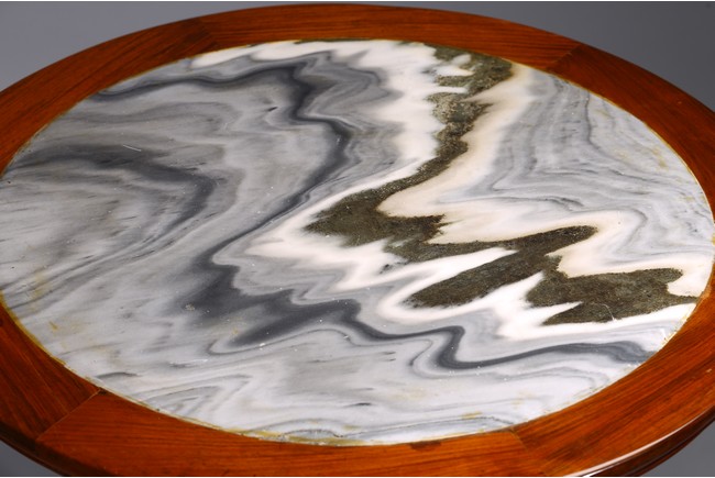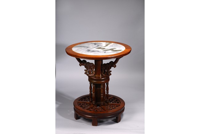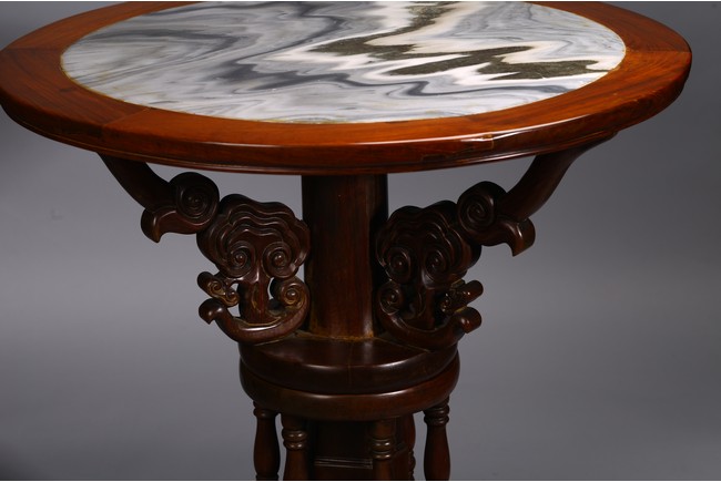 The table inset with a circular marble panel with natural the panel painted with a central roundel of birds amongst pine and chrysanthemum issuing from rockwork within bands of mountainous landscape scenes,dragons chasing flaming pearls and a floral border,the table carved with precious objects around the side,the base raised on three scrolling supports and carved with bands of dragons,ruyi and petals. 19th century, Qing Dynasty period.
