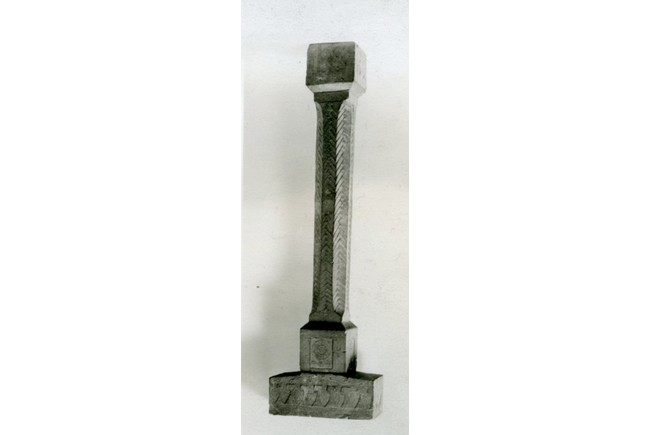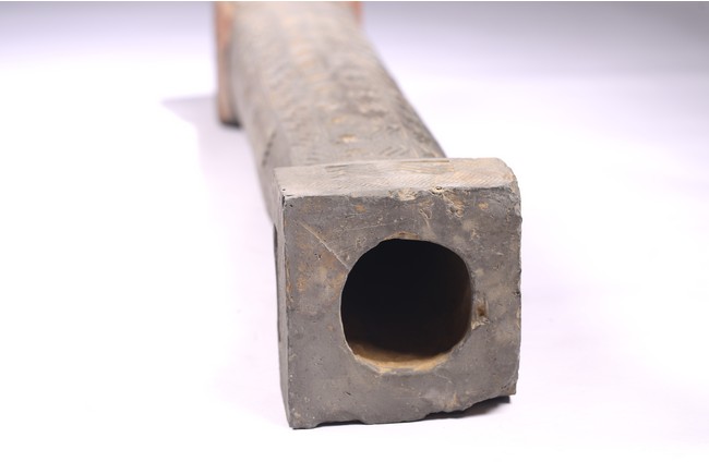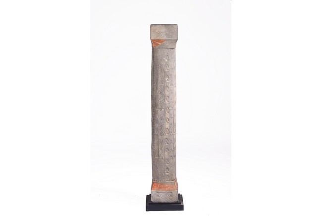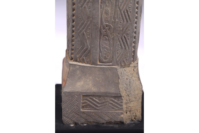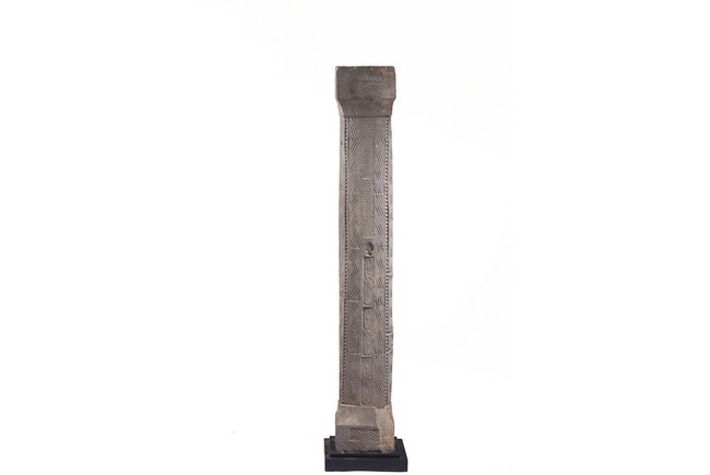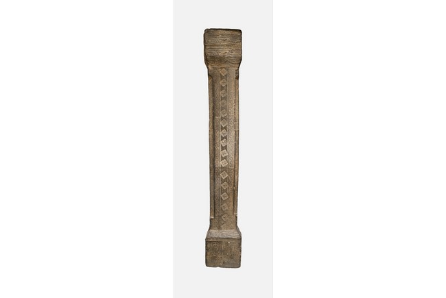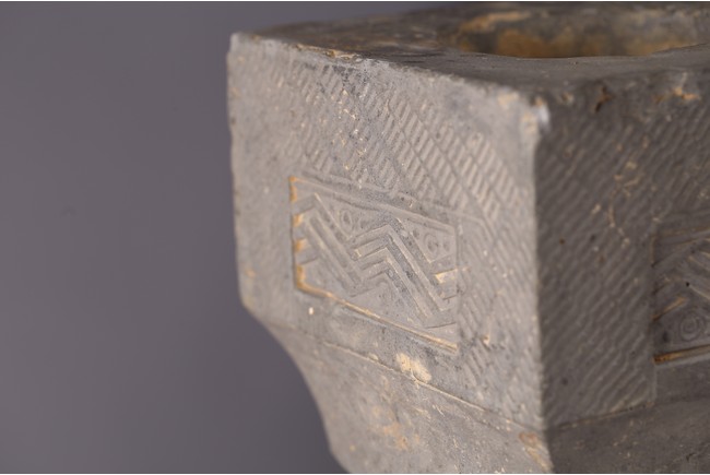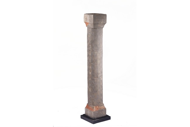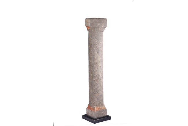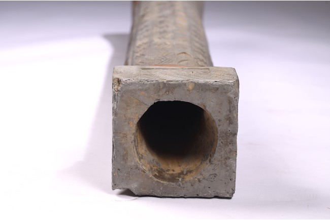 The gray hollowed earthenware pillar impressed and carved with rows of geometric design interrupted by rows of leaf motifs at the four corners. Western Han dynasty (206 B.C.–A.D. 9),1st century B.C.