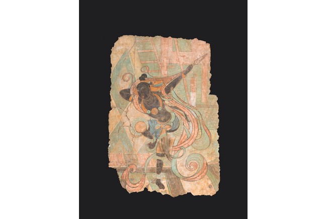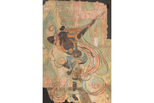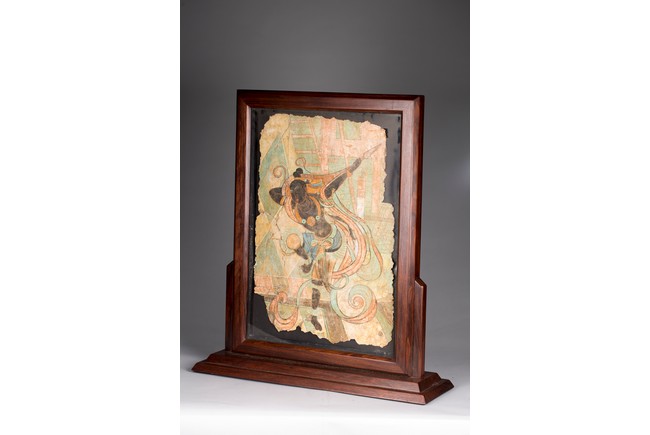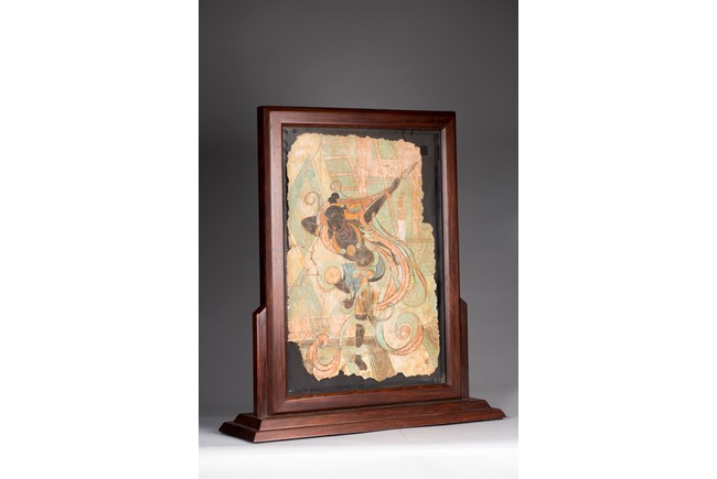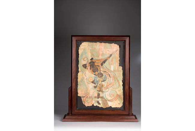 Possibly wall fragment from Dunhuang (Mogao Cave), Gansu, China. depicting a court dancer or apsara playing instrument,wearing a large bead necklace with celestial ribbons. Display within hardwood frame and stand. Possibly Tang Dynasty period.