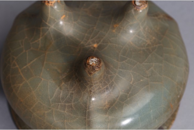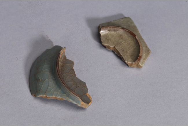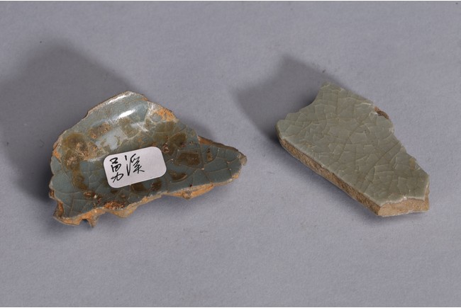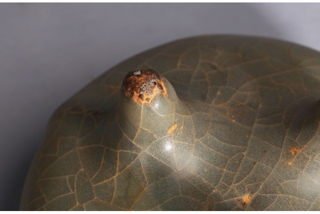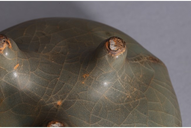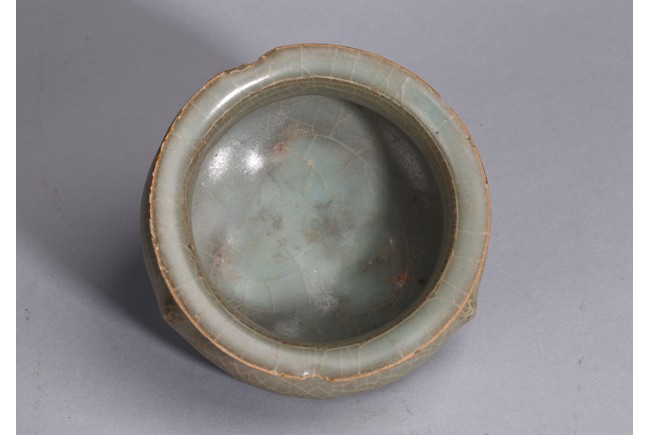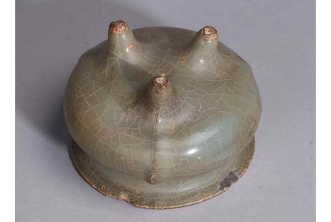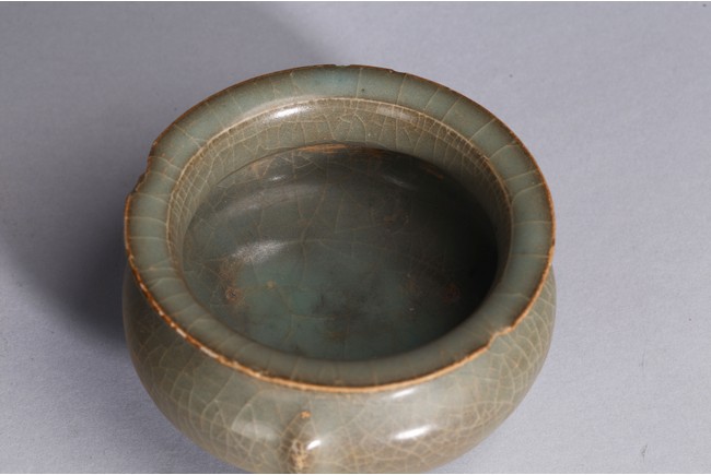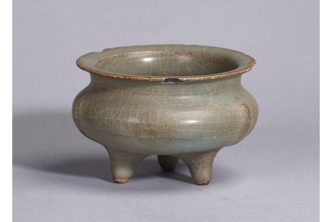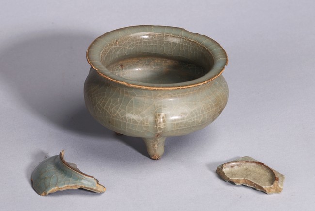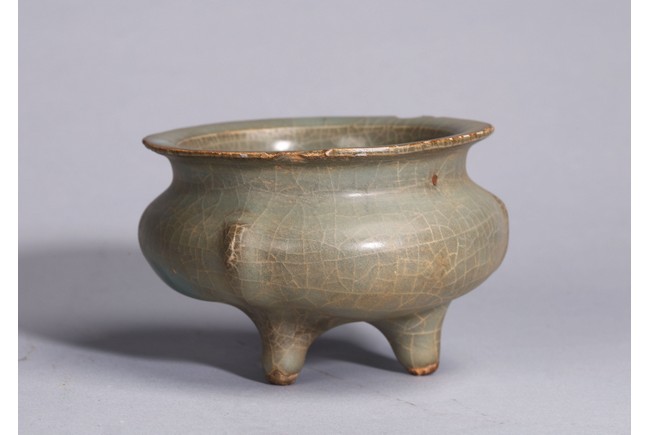 The censer is potted with a compressed globular body supported on three feet and surmounted by a cylindrical neck rising to a flat everted rim, with three flanges beginning on the shoulder and trailing down each leg. The censer is covered with a finely crackled glaze of greyish-green tone, revealing the brownish body at the feet. Along with two similar glazed porcelain fragments. Song/Yuan Dynasty period.