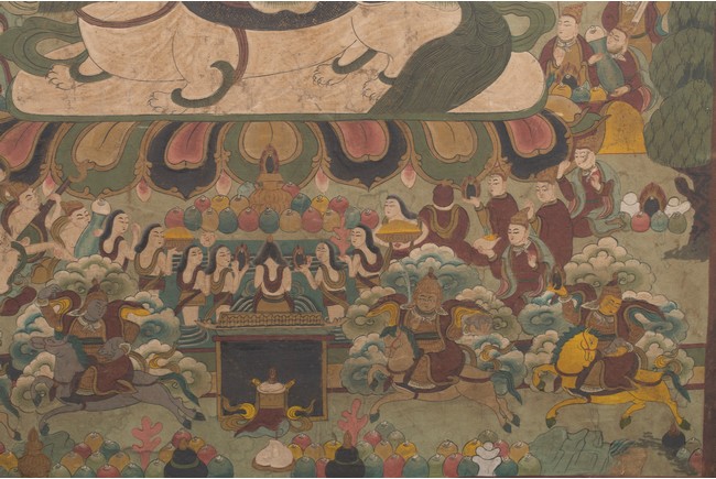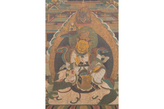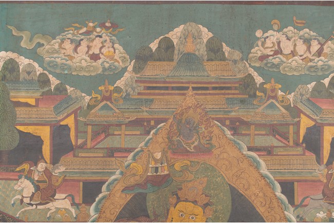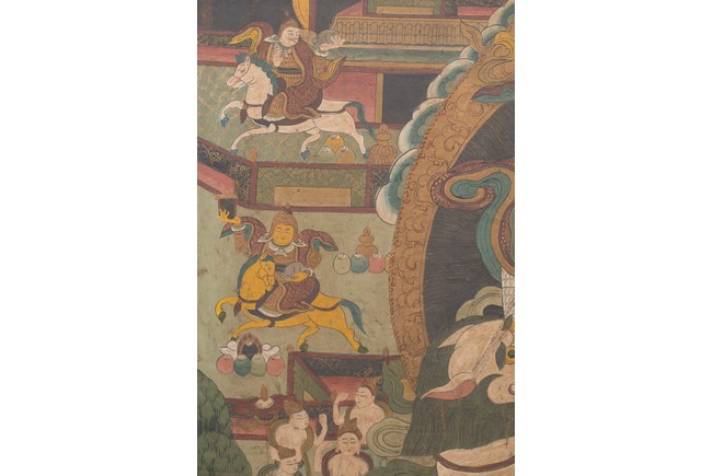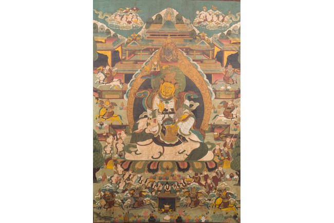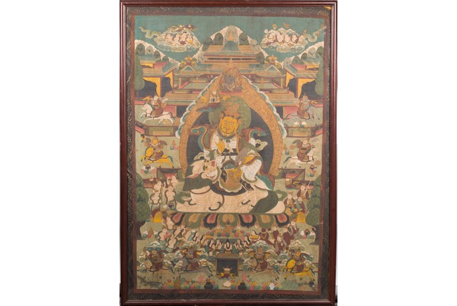 The central figure wearing armor and riding a lion against background of palaces,surrounded by smaller figures,celestial apsara on top,framed and mounted on brocade. Tibet,19th century.