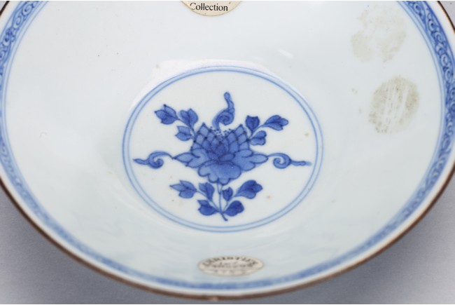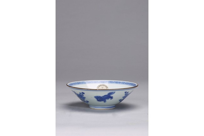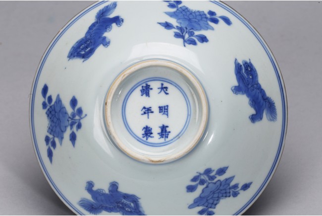 The exterior finely painted on the exterior with buddhistic lions alternating with peony sprays,the interior with a central peony spray,the base inscribed with six character apocryphal Jiajing mark. Qing Dynasty Shunzhi period,17th century.