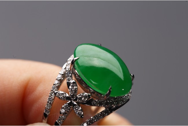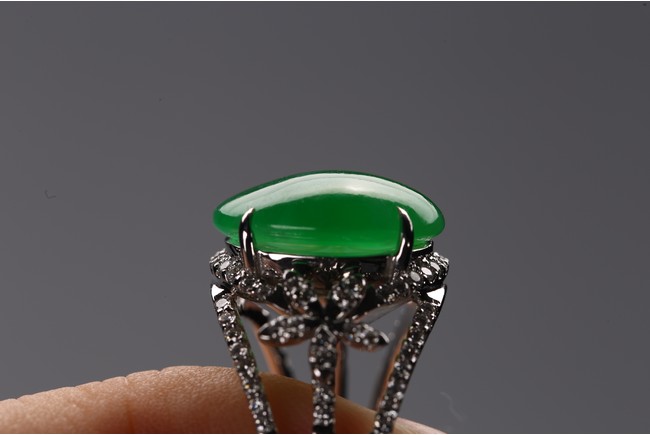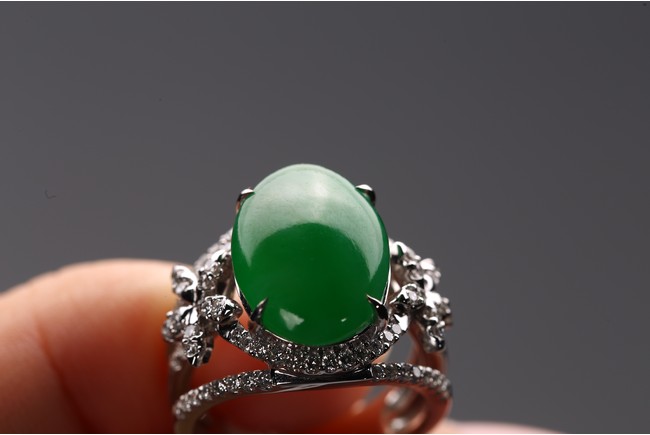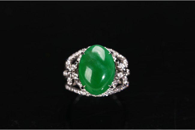 This translucent oval double cabochon jadeite stone set on a 18K white gold ring. Accompanied with a Mason-Kay jade laboratory report 14114-1 stating it has no dye or polymer detected - A jade.