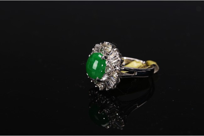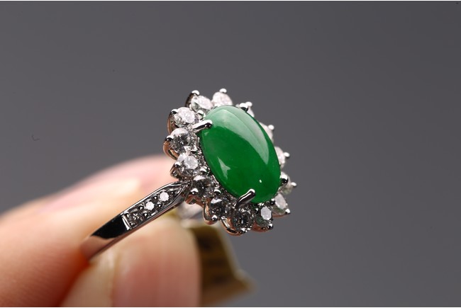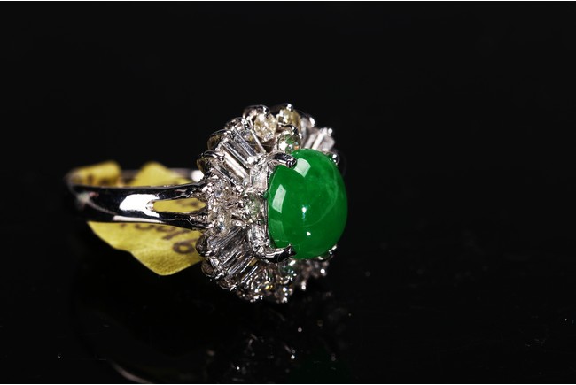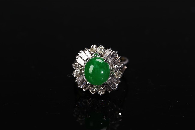 This translucent round jadeite cabochon set in a white gold ring with numerous diamonds.