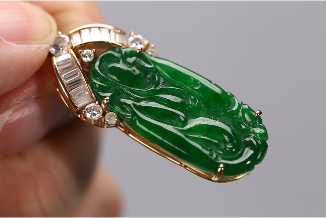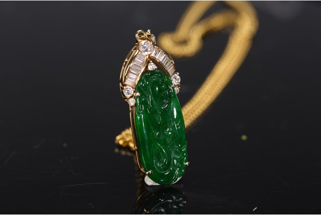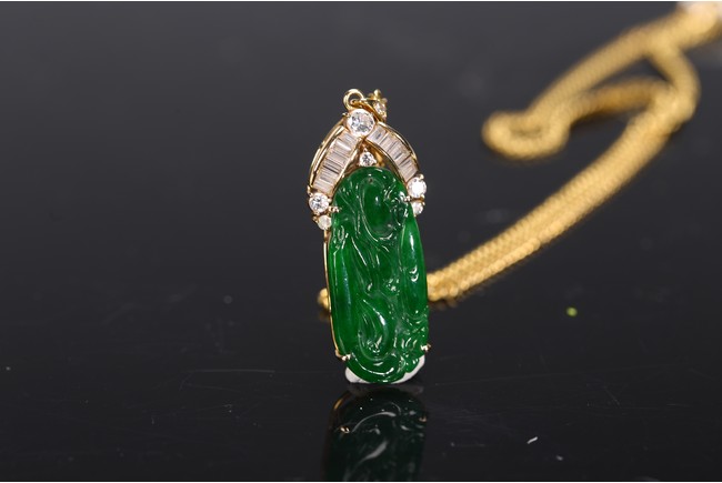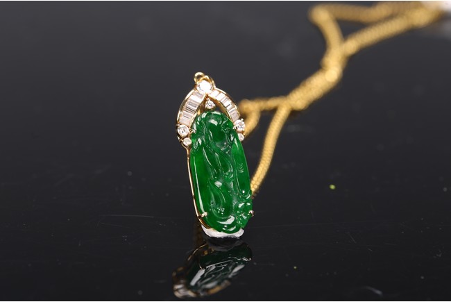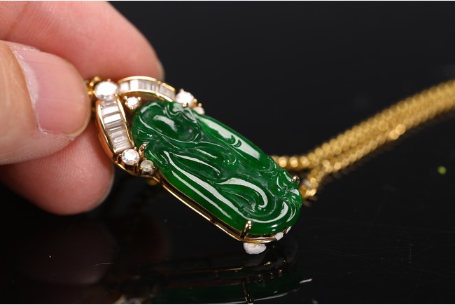 The jadeite pendant of emerald green tone,carved as gourds hanging on branch,surrounded by various cut diamonds,gold chain. Accompanied with GIA report 2223660262 indicating it is natural color and no indications of impregnation.