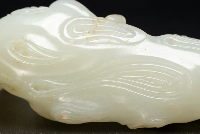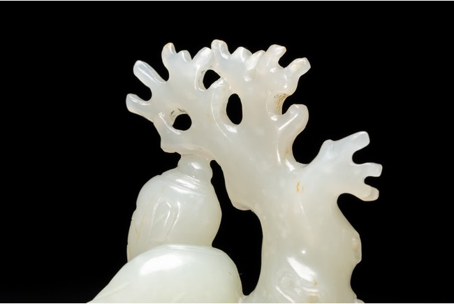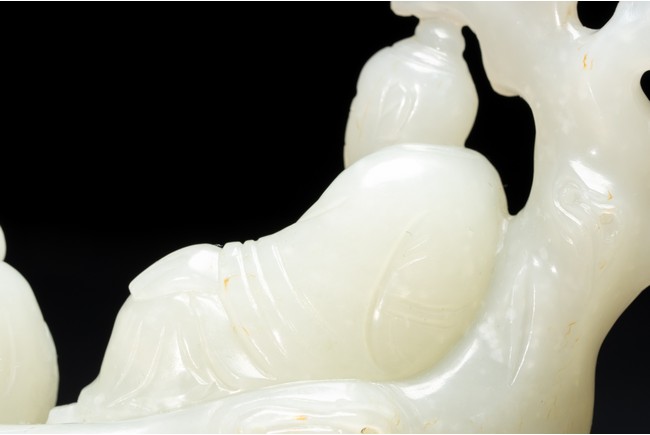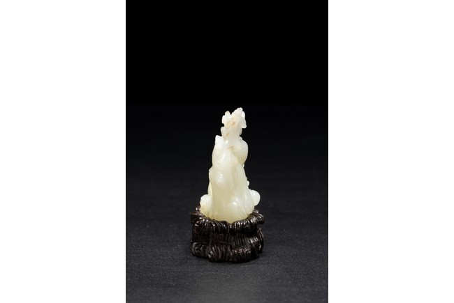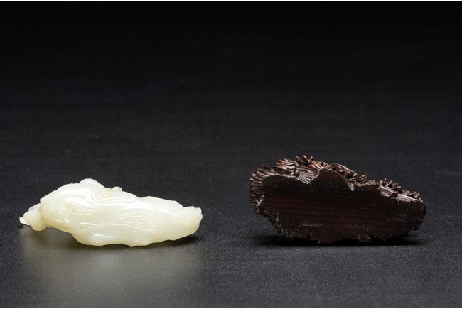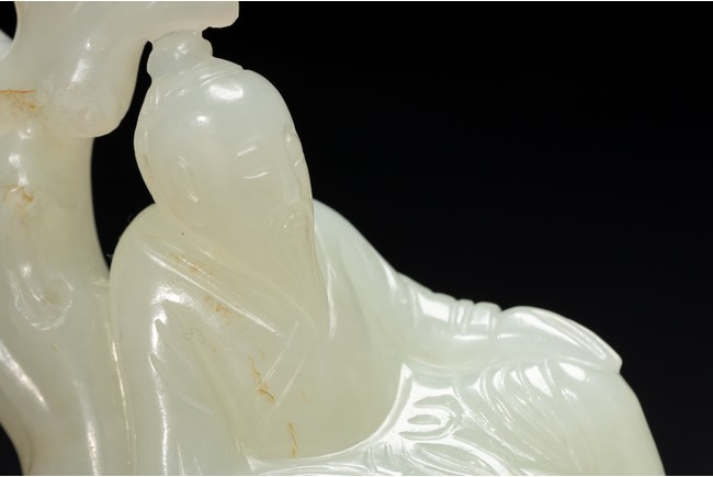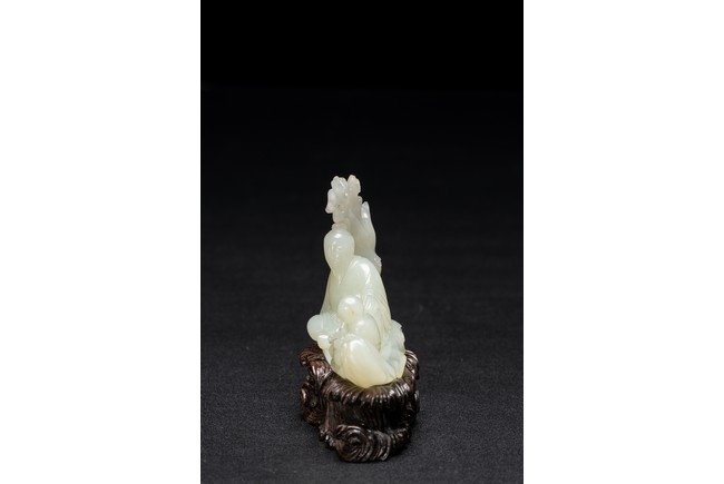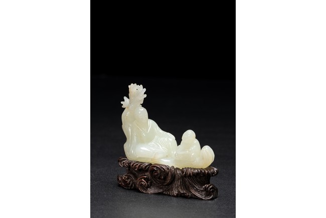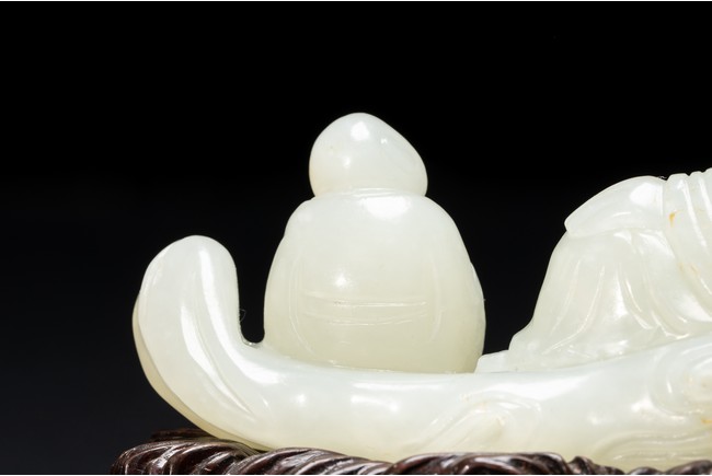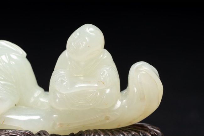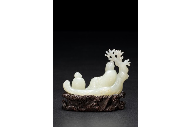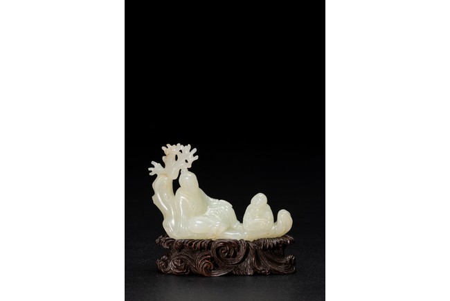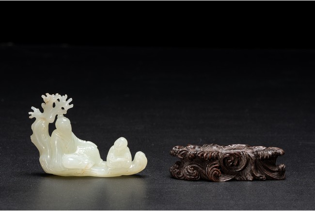 Carved with a elderly scholar rested in the rear of the raft against a gnarled branch,accompanied by a seated young boy,the stone of an even white tone,zitan stand. Qing Dynasty period.
