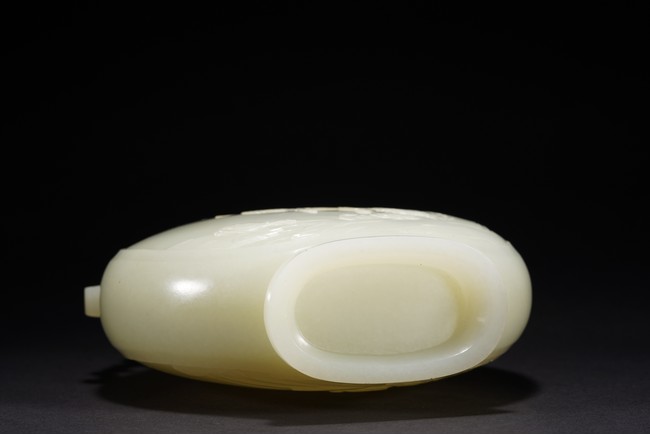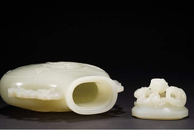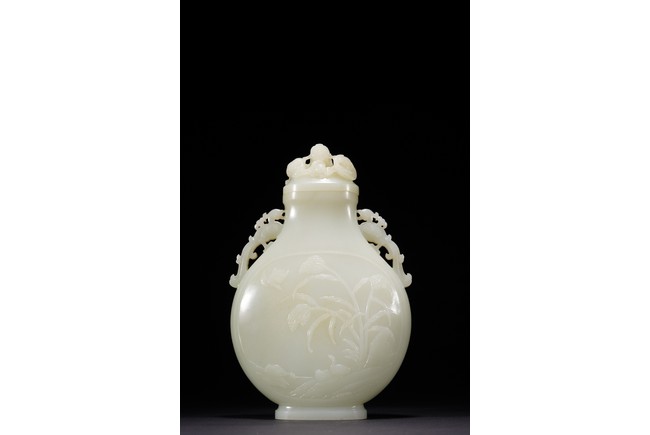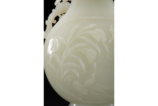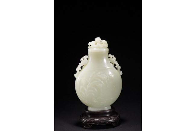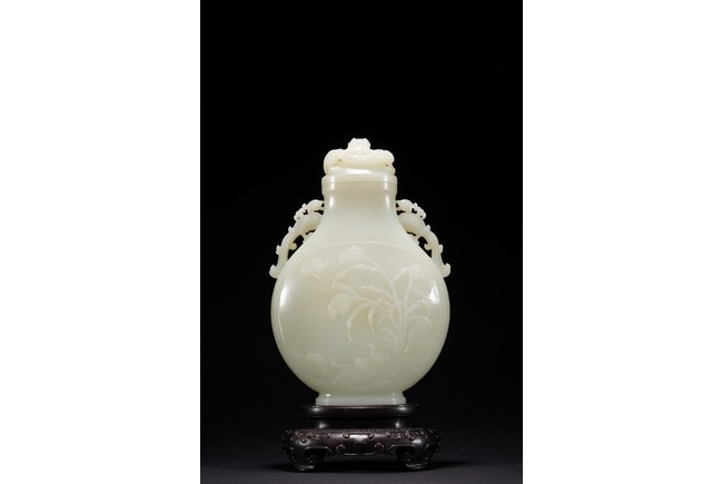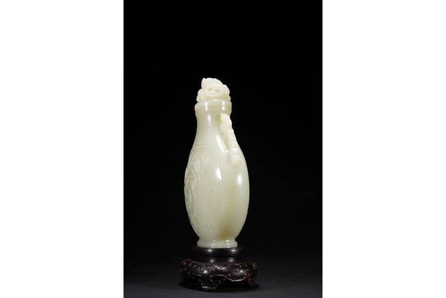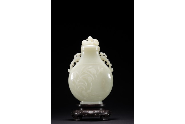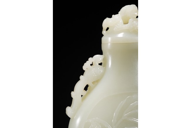 Of flattened globular form, finely carved on each side with quails and stalks of millet, the waisted neck flanked by a pair of stylised phoenix handles, the cover surmounted with a seated mythical beast, the lustrous stone of white tone with faint russet inclusions, zitan wood stand.