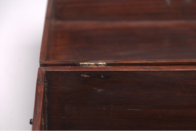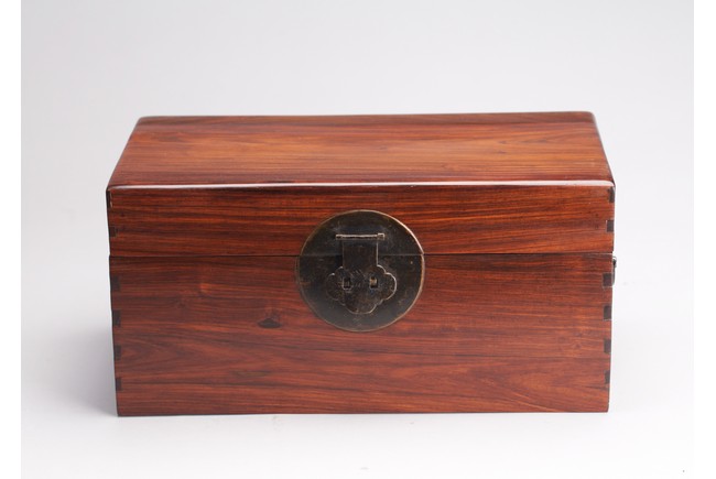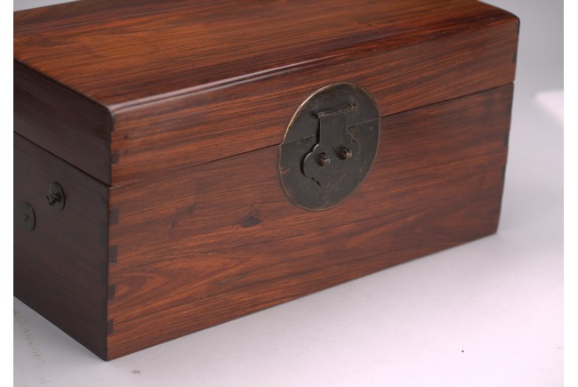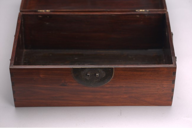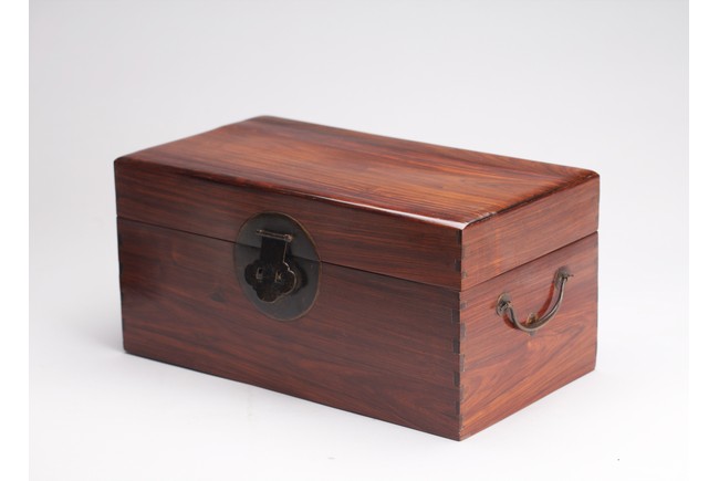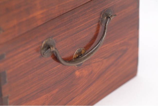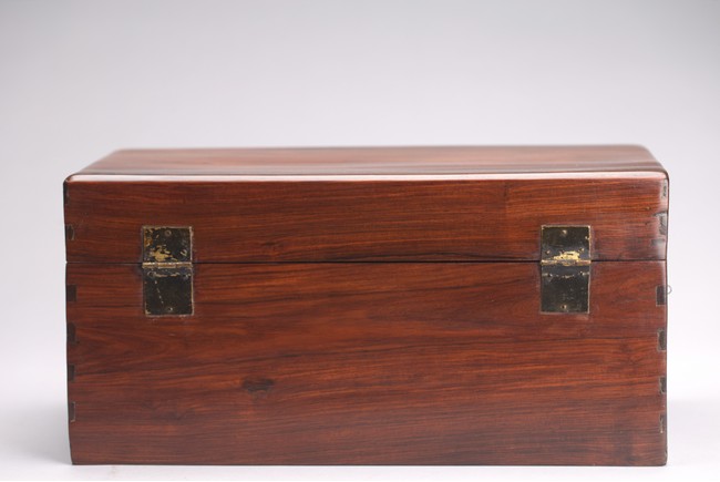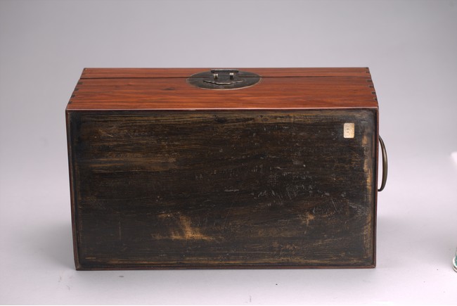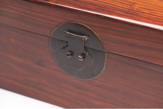 of rectangular form,the front embellished with a lock plate and a ruyi-shaped hasp,the sides flanked by a pair of C-shaped handles,fitted with bail handles with knocking plates. Qing Dynasty period.