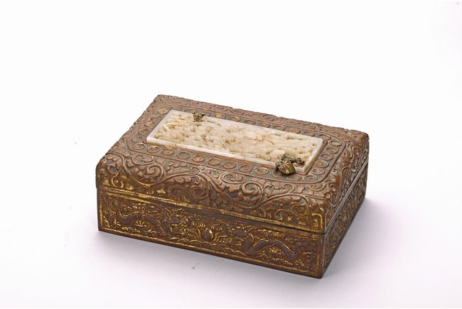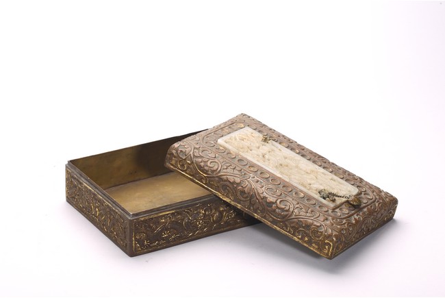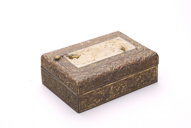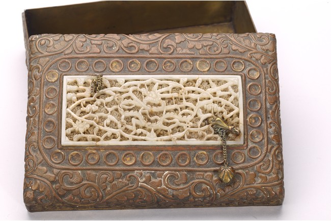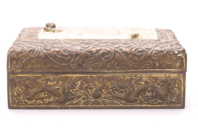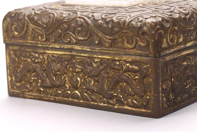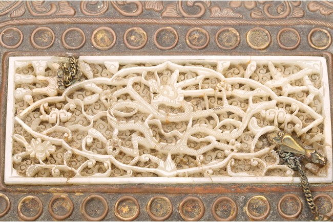 The Ming dynasty period white jade reticulated dragon plaque depicting openwork carving of dragon writhing amidst flowers and clouds,set in a 19th century gilt copper alloy jewelry box. Jade Ming Dynasty period.