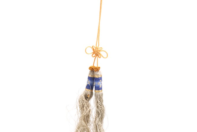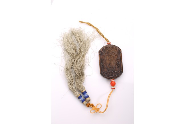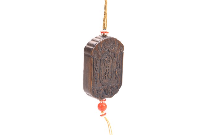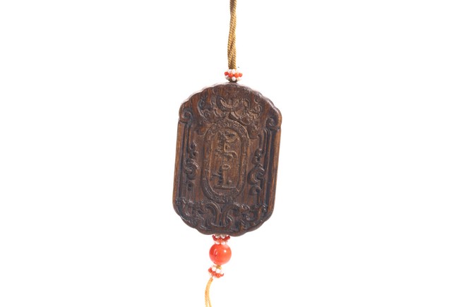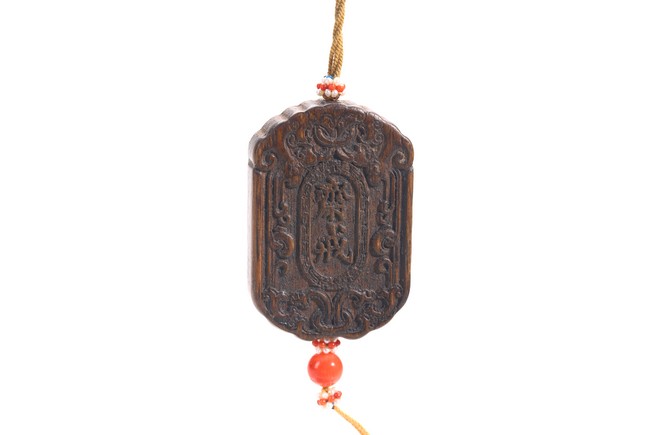The plaque carved with two characters 'Zhai Jie' within a oval shaped panel,surrounded by stylized scrolls in relief.