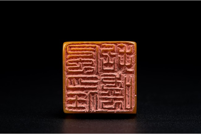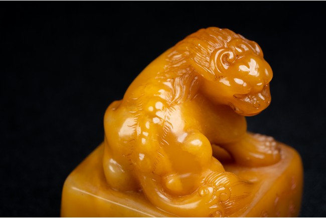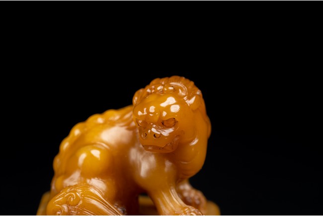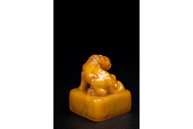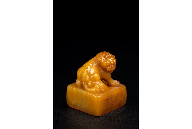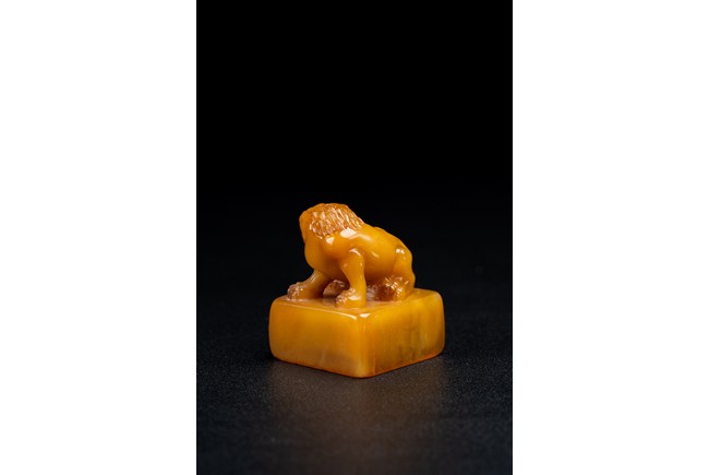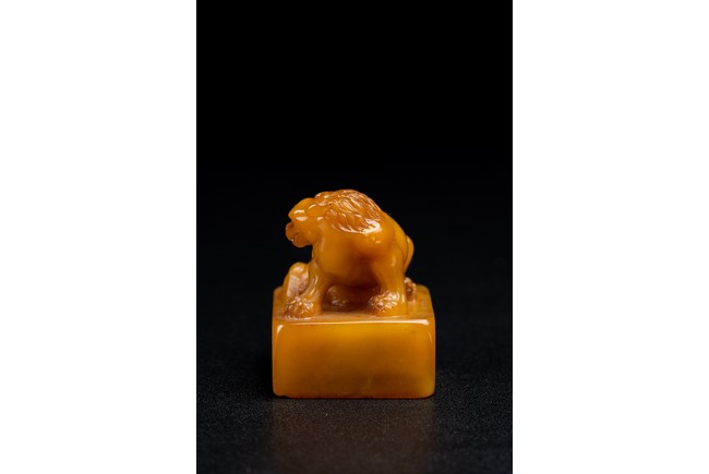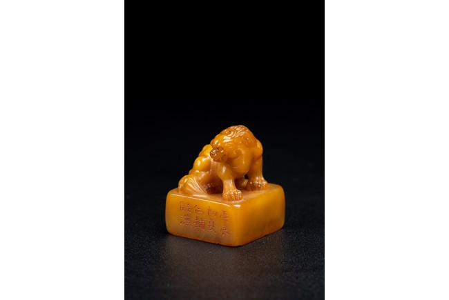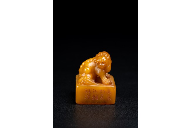 Of square form,the golden-orange stone seal surmounted with a buddhist lion skillfully carved in round,the sides of the seal carved with eight characters inscription,the seal face further carved with four characters. Qing Dynasty period.