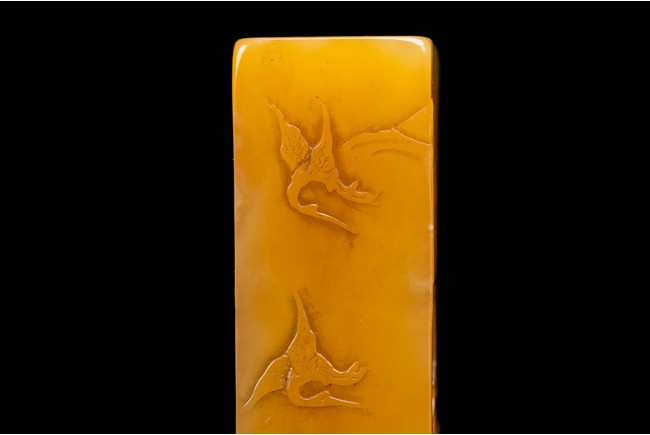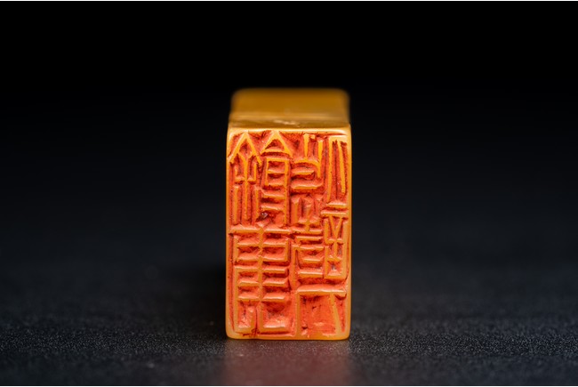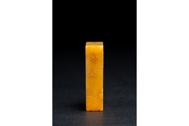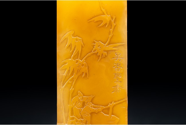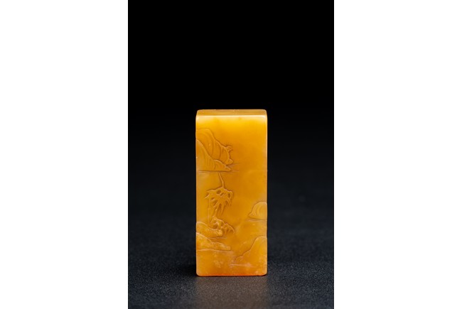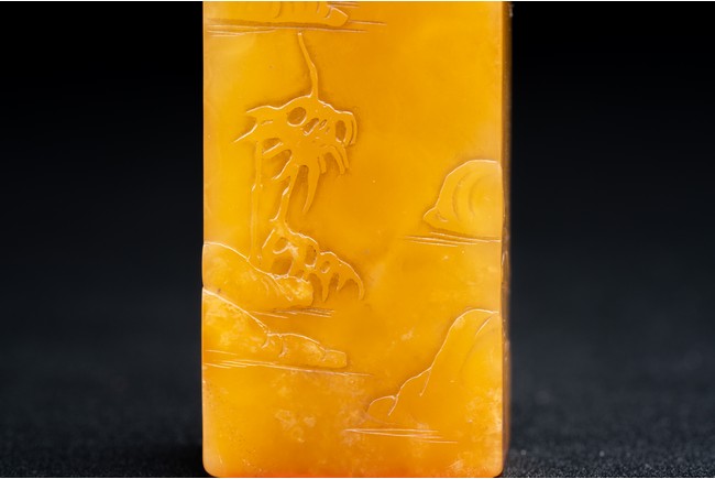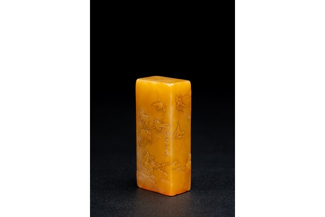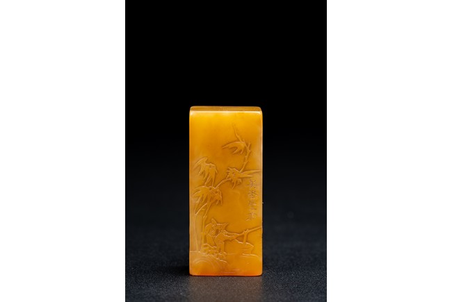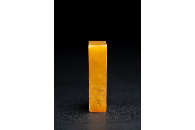 Of rectangular form,the sides of the seal carved in shallow relief with landscape,bamboo,figures,and inscribed with four characters vertically. The seal face carved with four characters. The stone is of golden-orange tone. Qing Dynasty period.
