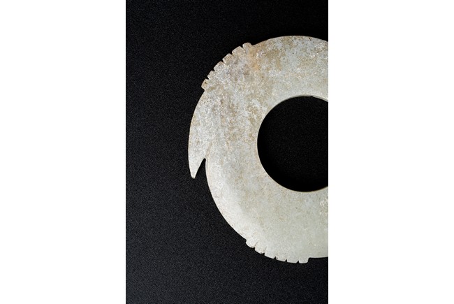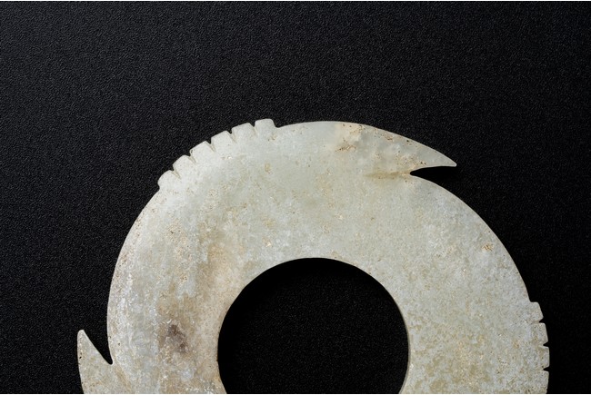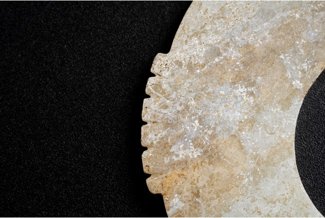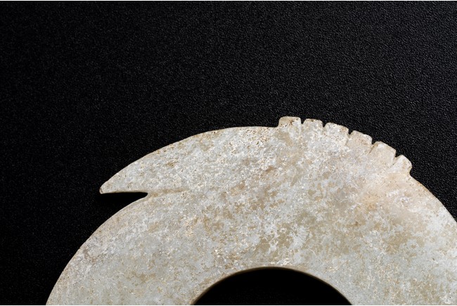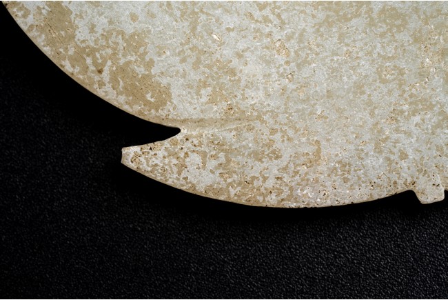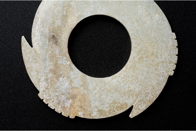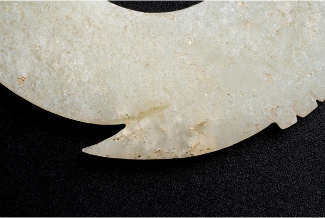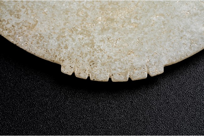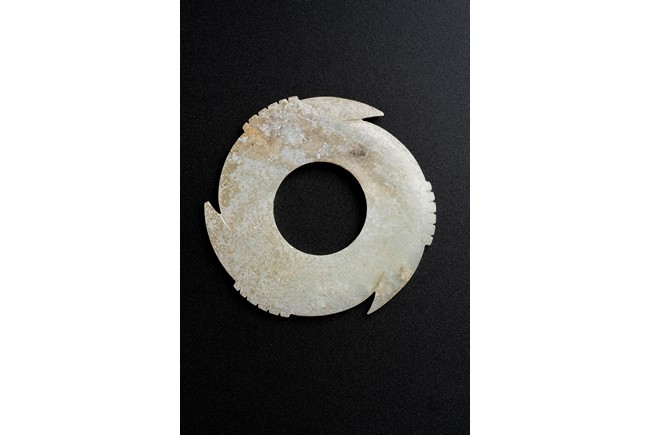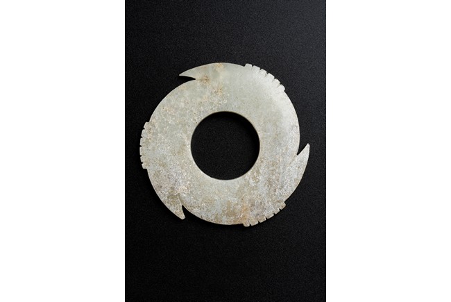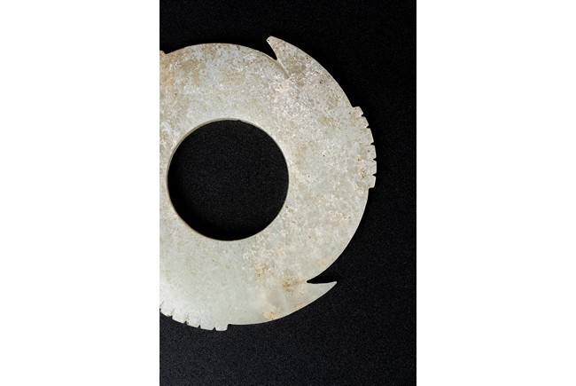 With three deeply cut notches forming three arcs,each set with a pair of three-pronged teeth,the stone is of opaque mottled celadon and russet tone. Longshan culture or later.