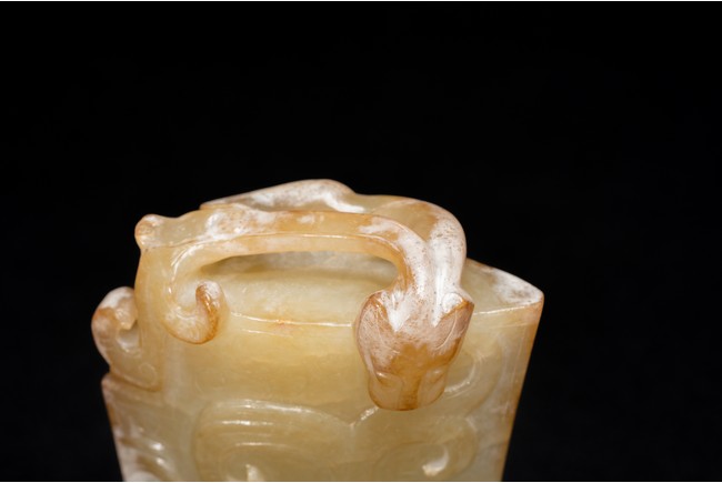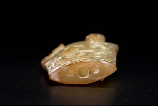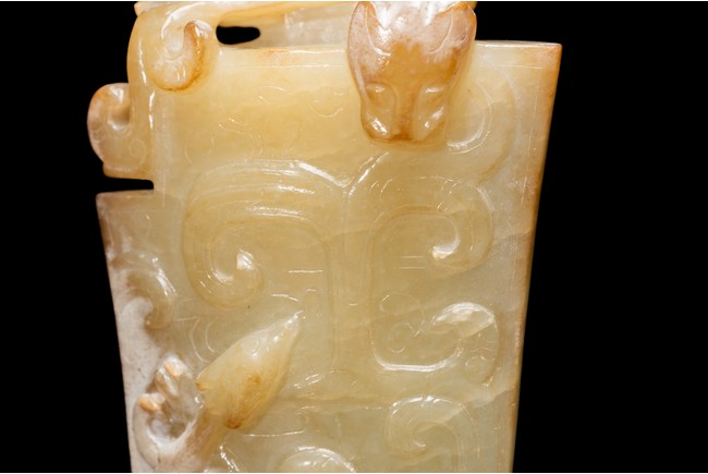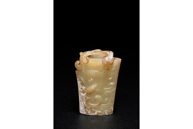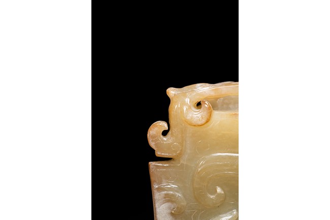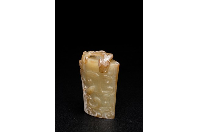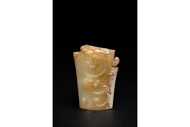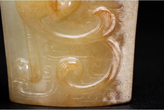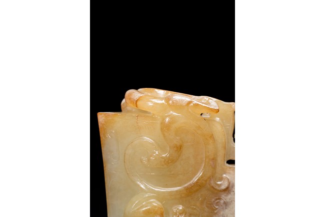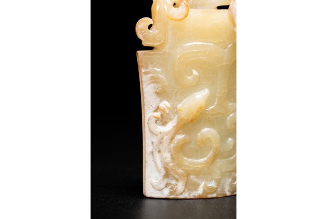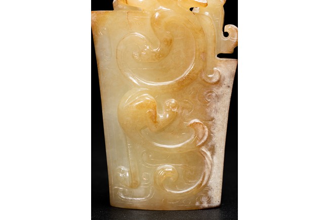 The jade chape carved with two raised sinuous chi dragons with its tail continuing towards the other side and on the top of the ornament. Western Han Dynasty or later.