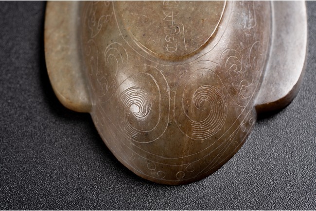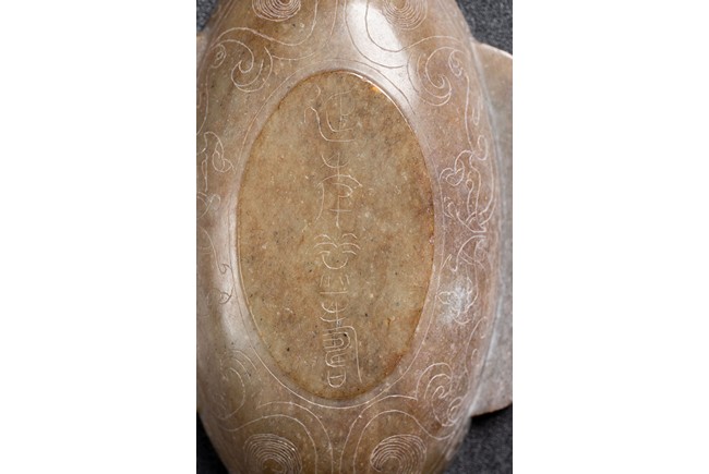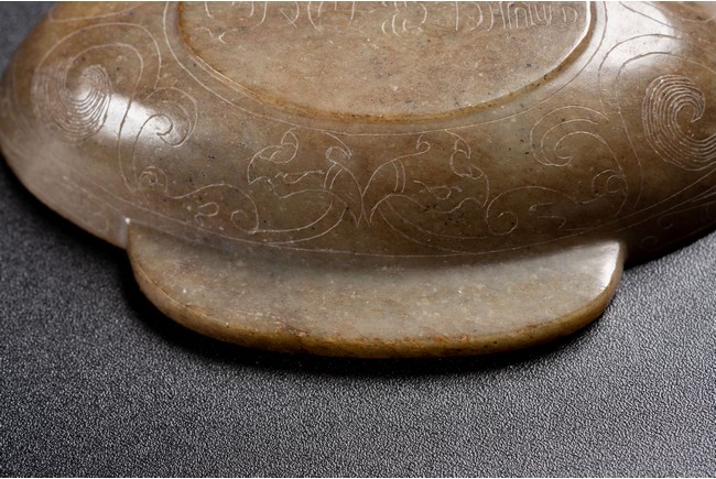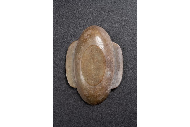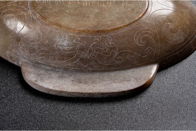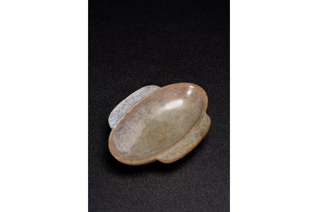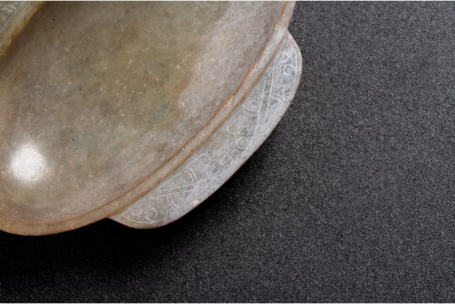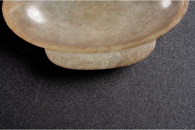 The shallow oval-shaped bowl with sturdy sides rising from a short foot,the main sides flanked by a pair of elongated 'ear' handles extending just below the mouth rim,further incised with scrolling patterns. Han Dynasty period.