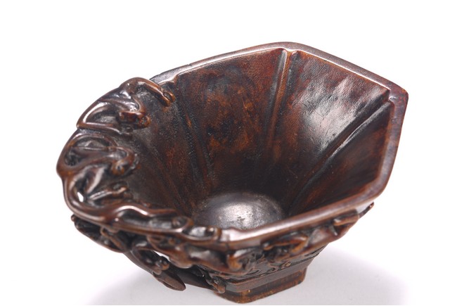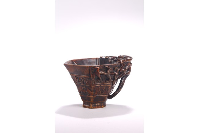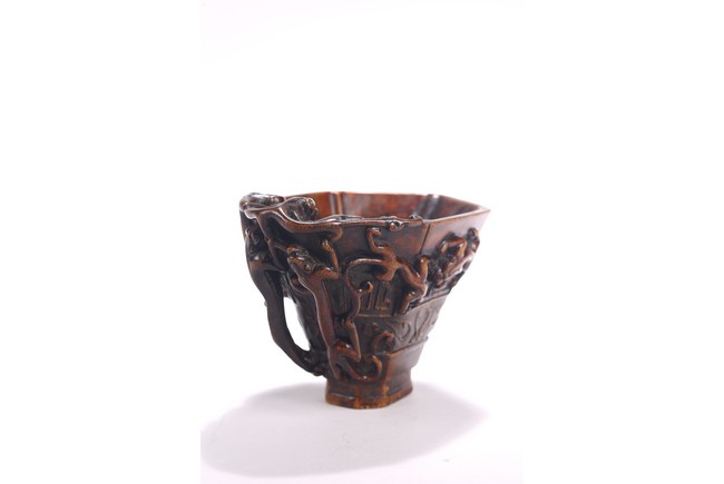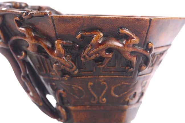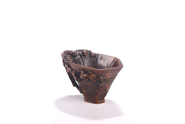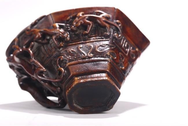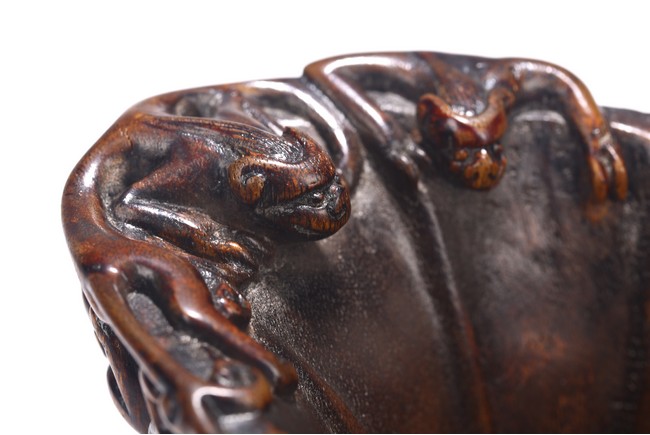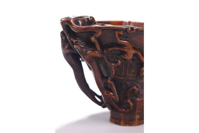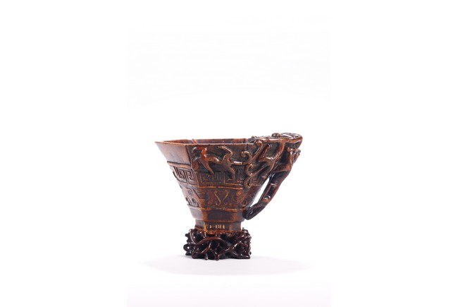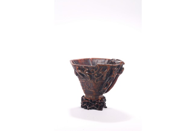 Carved in high relief with sinuous 'chi' dragons clambering on the body and top rim as handles,the body of the cup further carved with archaistic bands,supported on elaborately carved wood stand in the form of intertwined tree branches. 18th century,Qing Dynasty period.