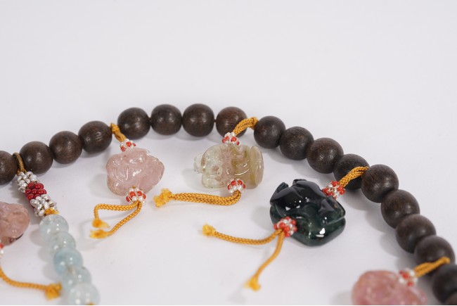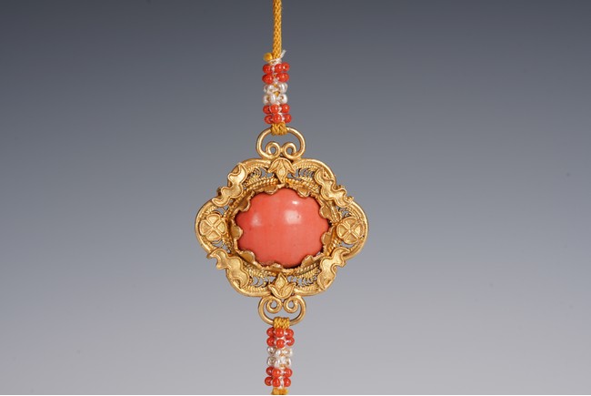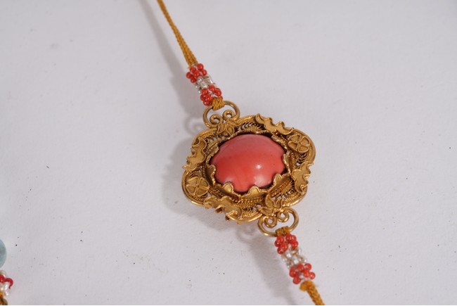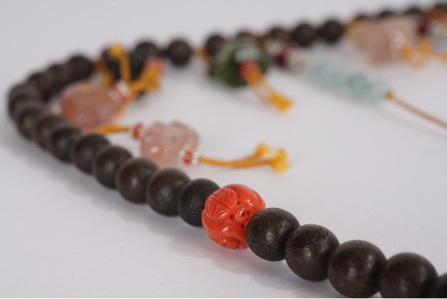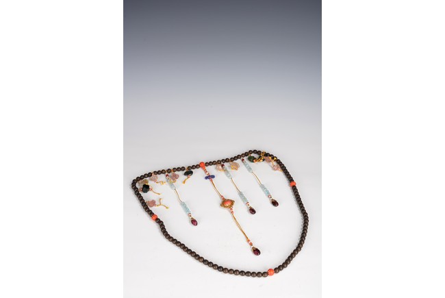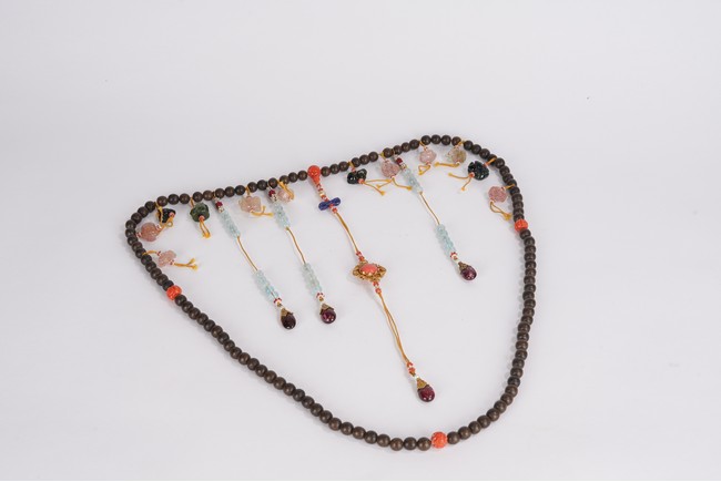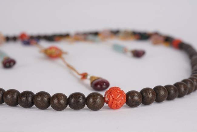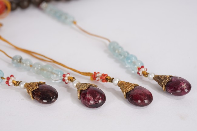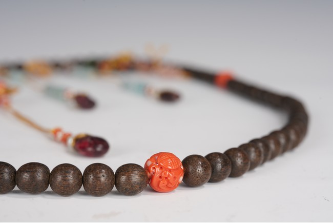 Consisting of 108 agarwoods and coral beads,with three long strands of bead quartz necklaces with tourmaline drop-shaped pendants. Qing Dynasty period.