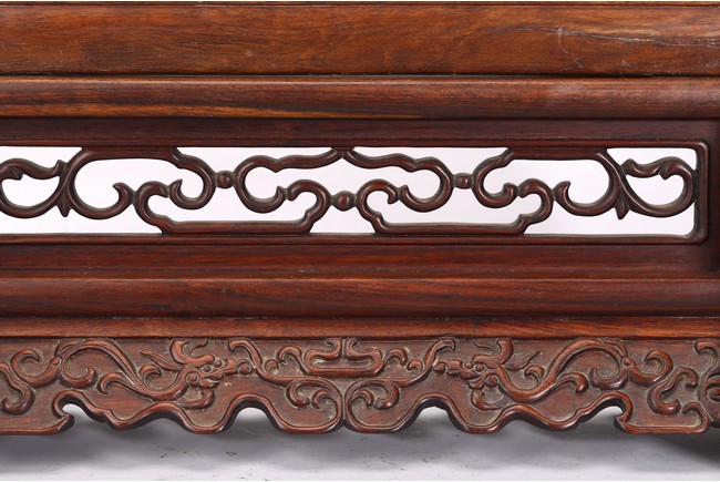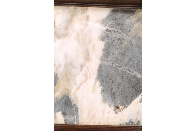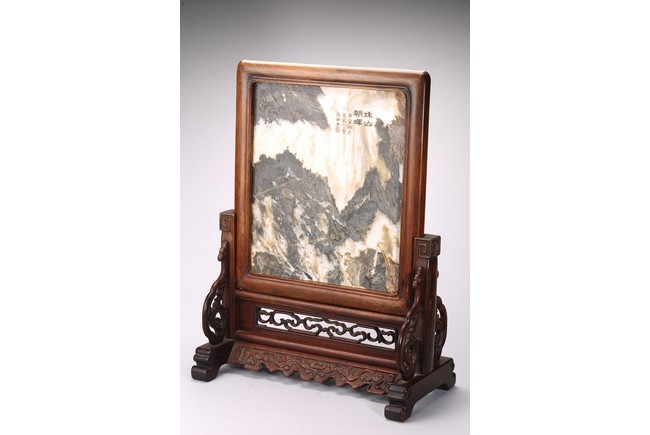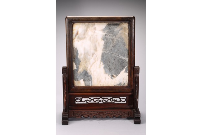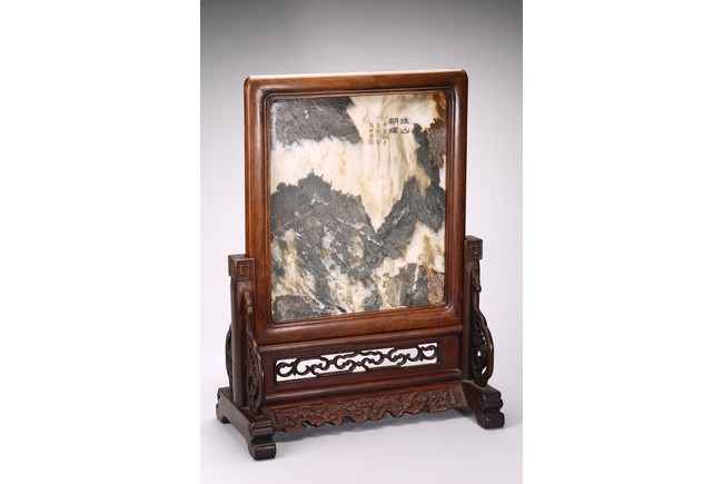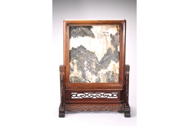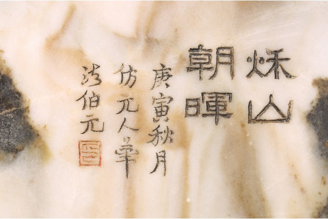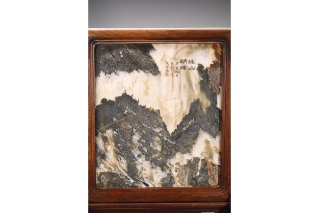 Chinese. the attractive creamy white tone marble with brown and grey veinings,depicting an autumn landscape of mountains in the morning,inscribed Qiushan Chaohui and signed Tang Yin with one red seal of the artist,mounted in a Huanghuali frame further supported on a carved wood stand. Qing Dynasty period,18th century