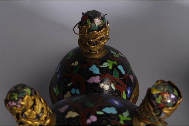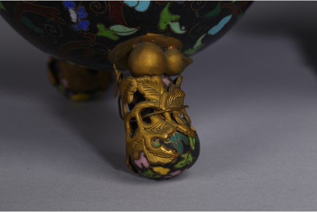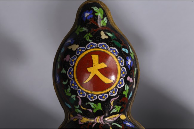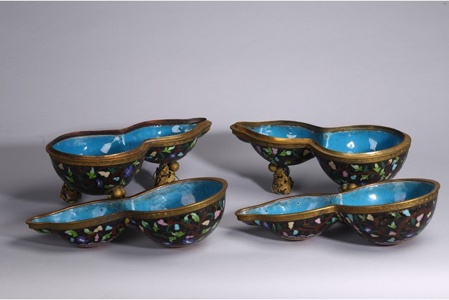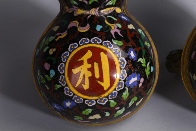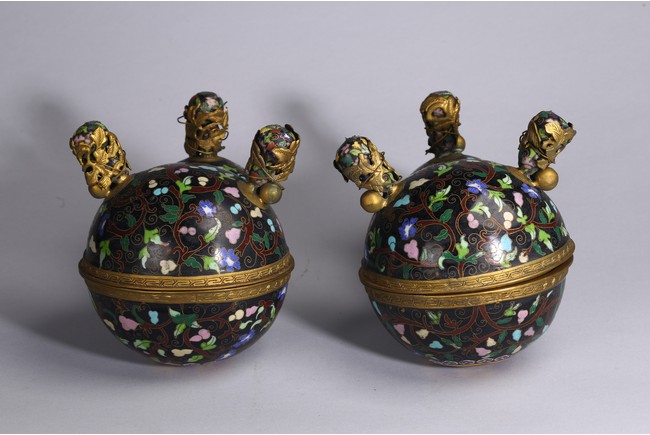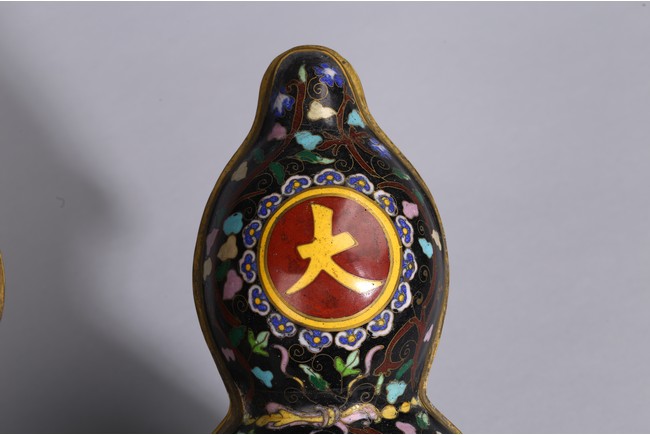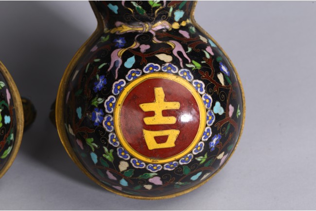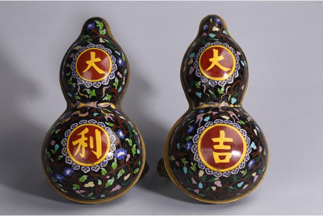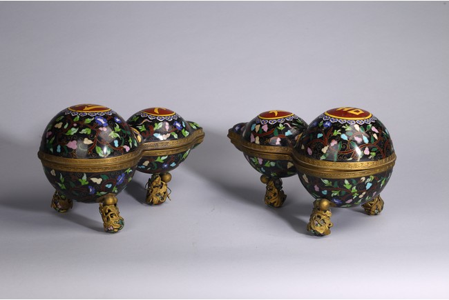 Each of double gourd case form,the upper half case enamelled with two character 'Da Ji',each encircled by ruyi-head border amid leafy scrolls,the lower half case supported on three knob feet wrapped by gilt-bronze leafy double gourds,all against cloisonne enamel black background of leafy vines. Qing Dynasty period.