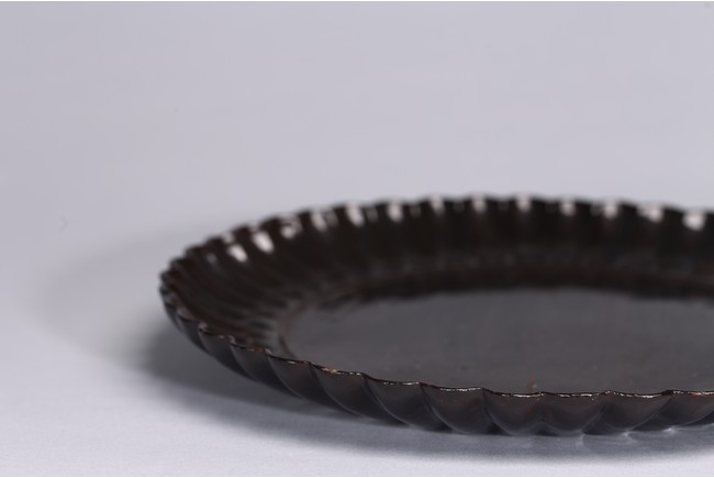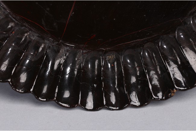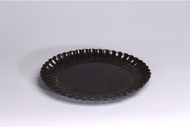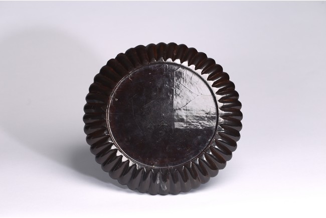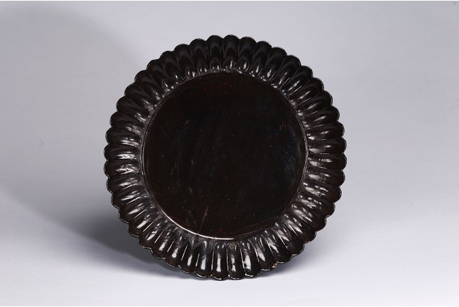 The dish delicately modelled with numerous lobes resembling radial chrysanthemum petals,all supported on countersunk base,overall covered in lustrous black lacquer,with age-related cracks and scratches. Yuan Dynasty period.